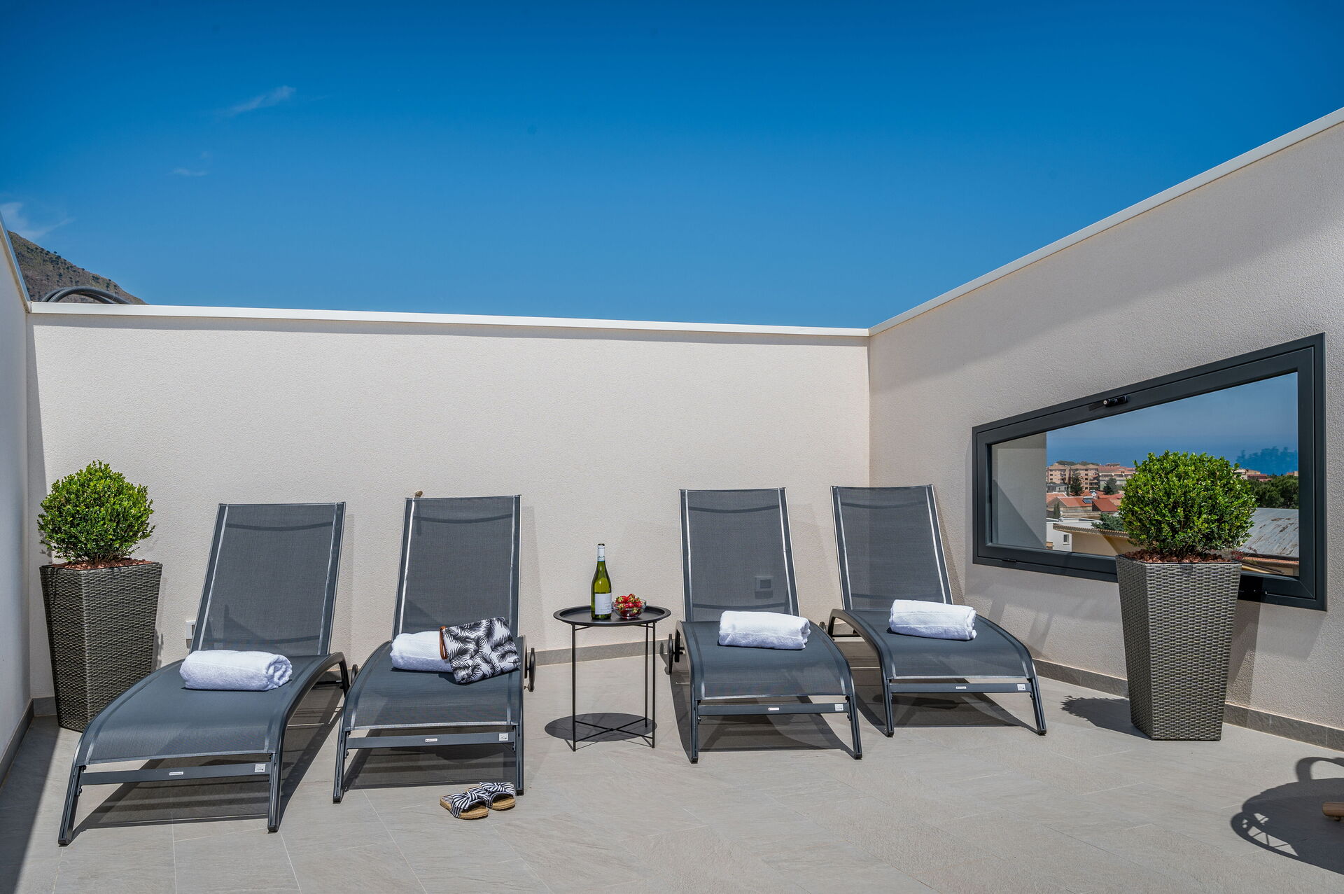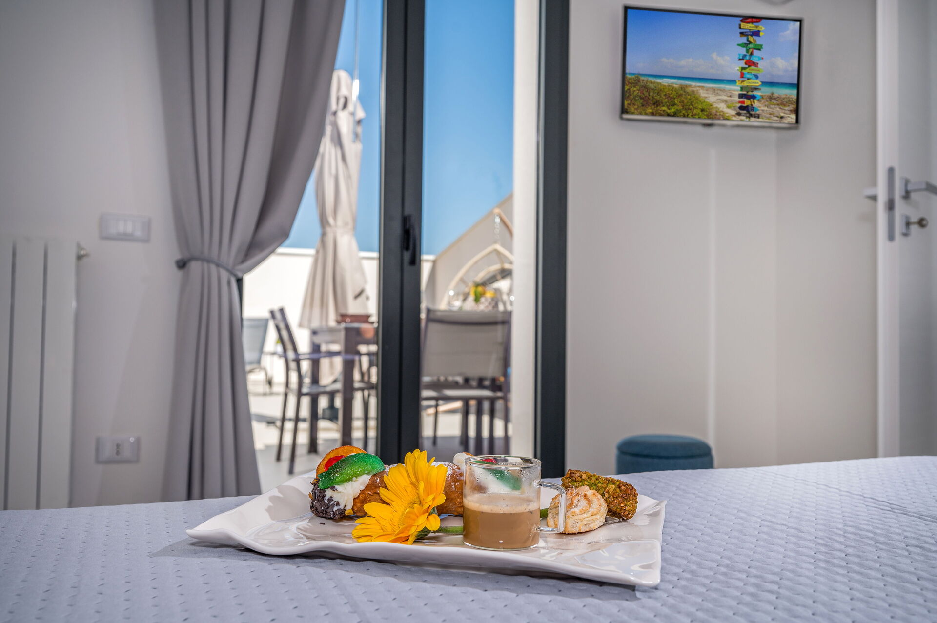 One of the highlights of the vacation apartment in Sicily is its spacious terrace. Here, a splendid panoramic view of the gulf offers a unique visual experience. The outdoor area is equipped with comfortable deck chairs, a large umbrella for sun protection, a table, and a rocking chair, inviting moments of pure relaxation, perfect for sipping a drink or reading a book while enjoying the view.