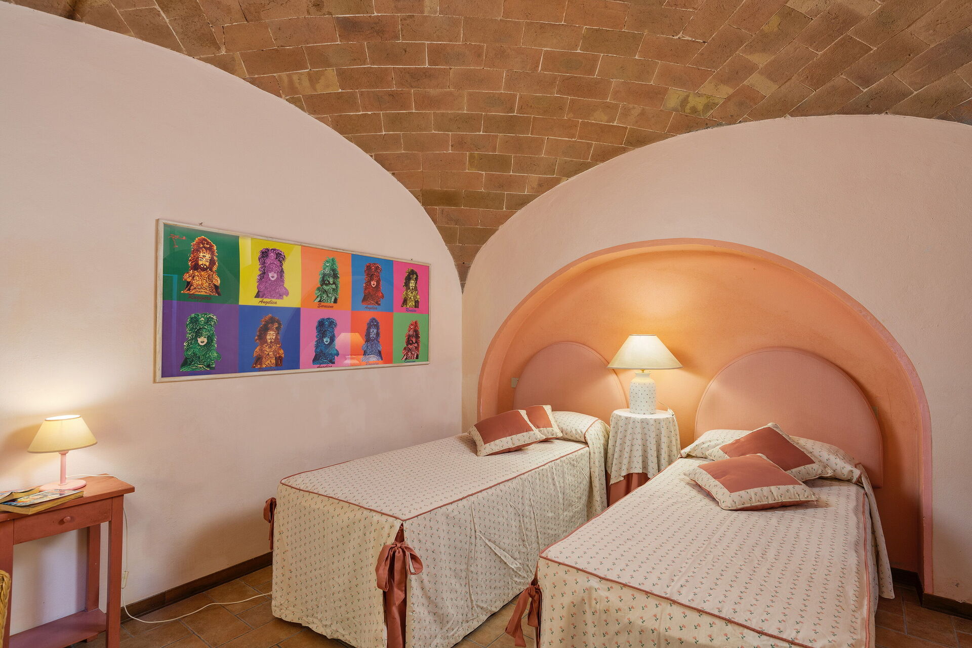 The master bedroom has wrought-iron beds with bedspreads and flowered curtains, and the pink-colored double room has a brick vaulted ceiling, herringbone terracotta floors and a window.