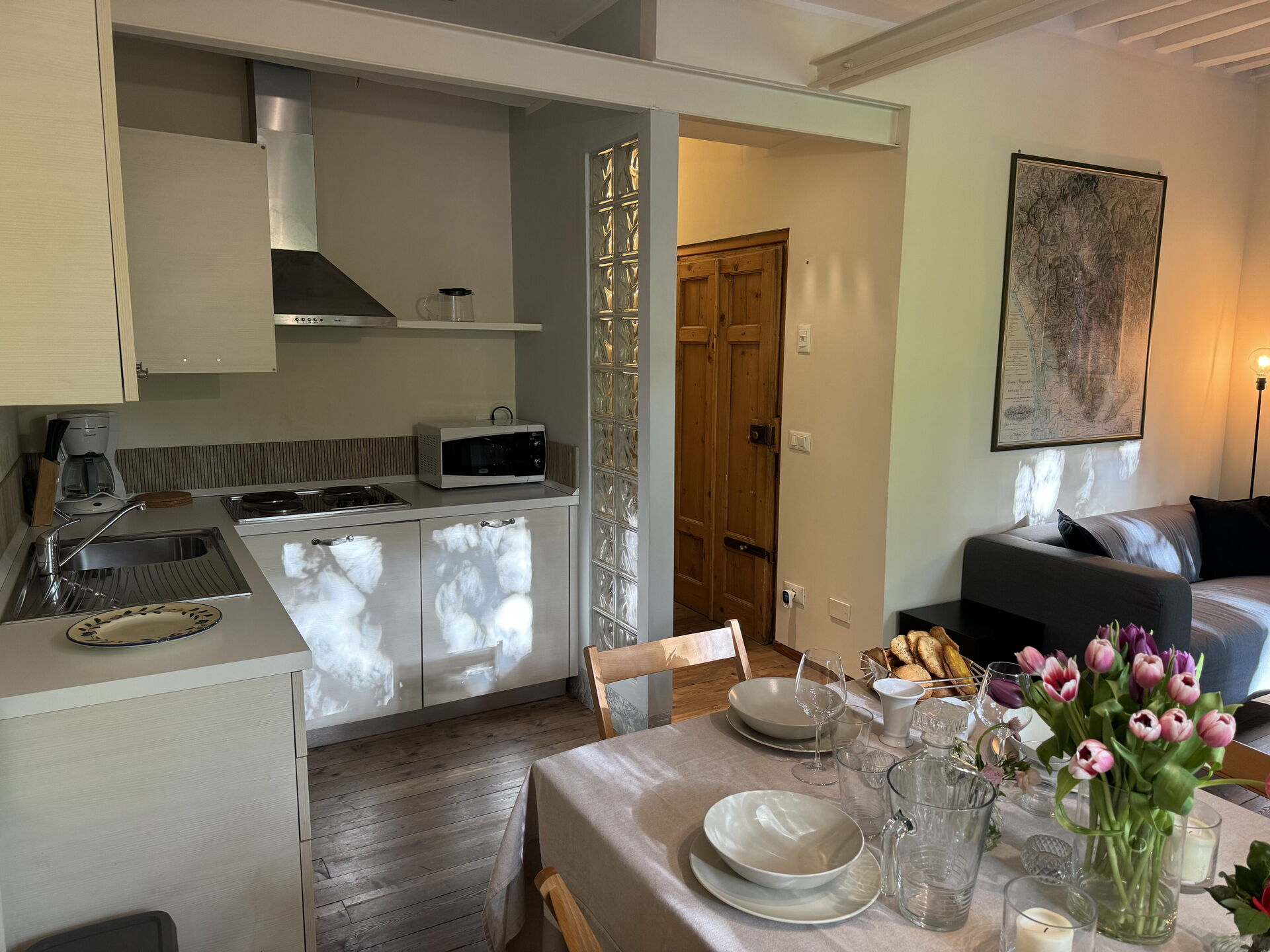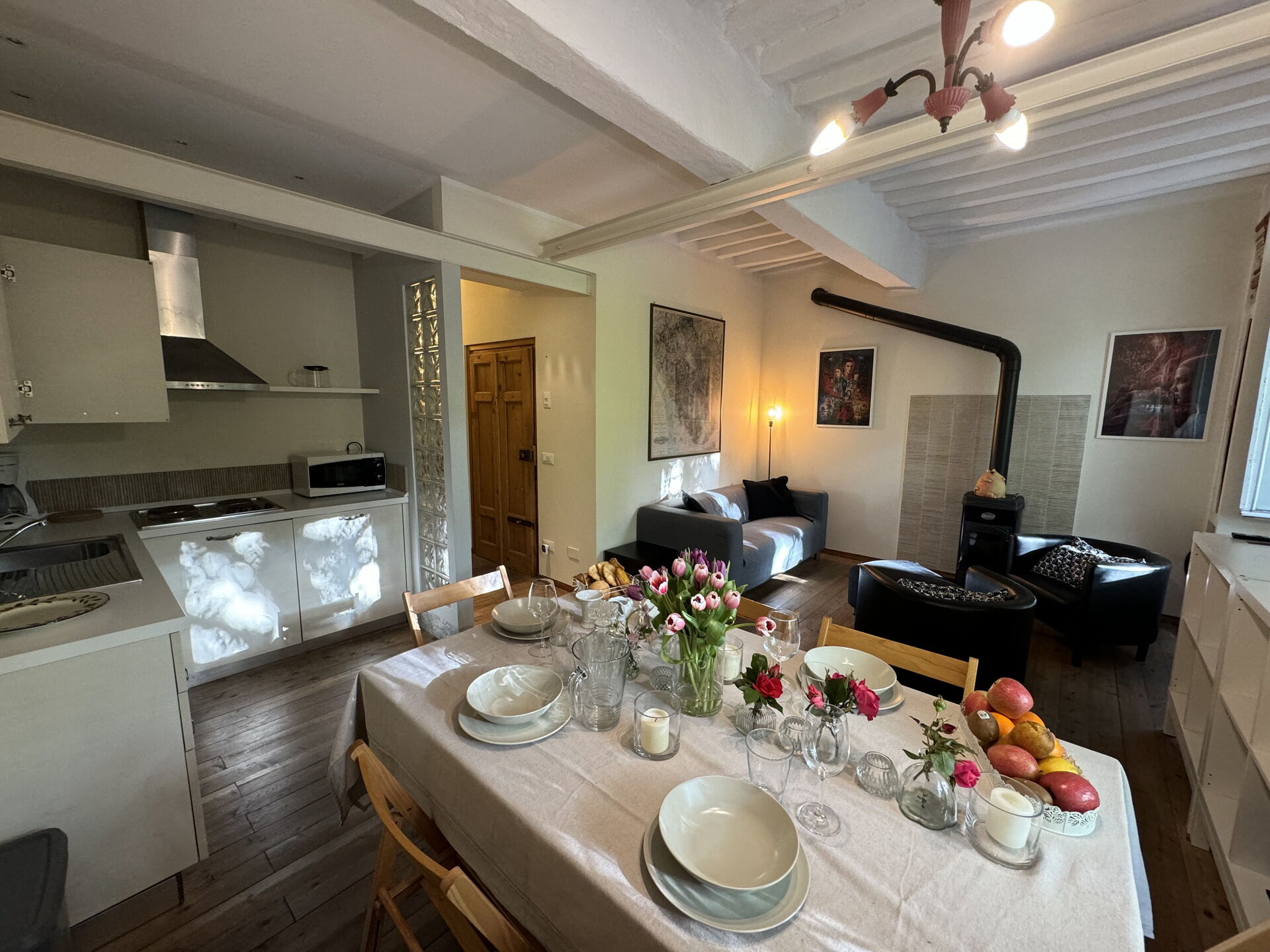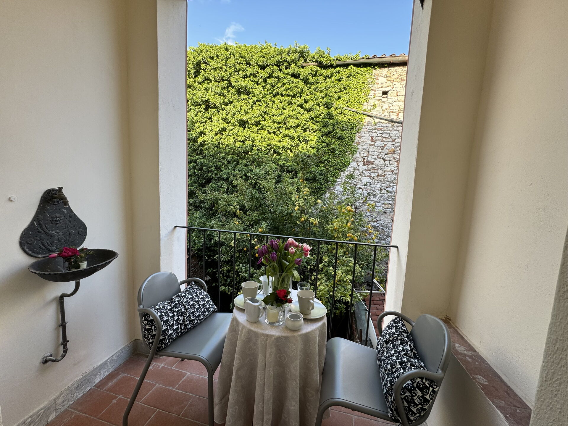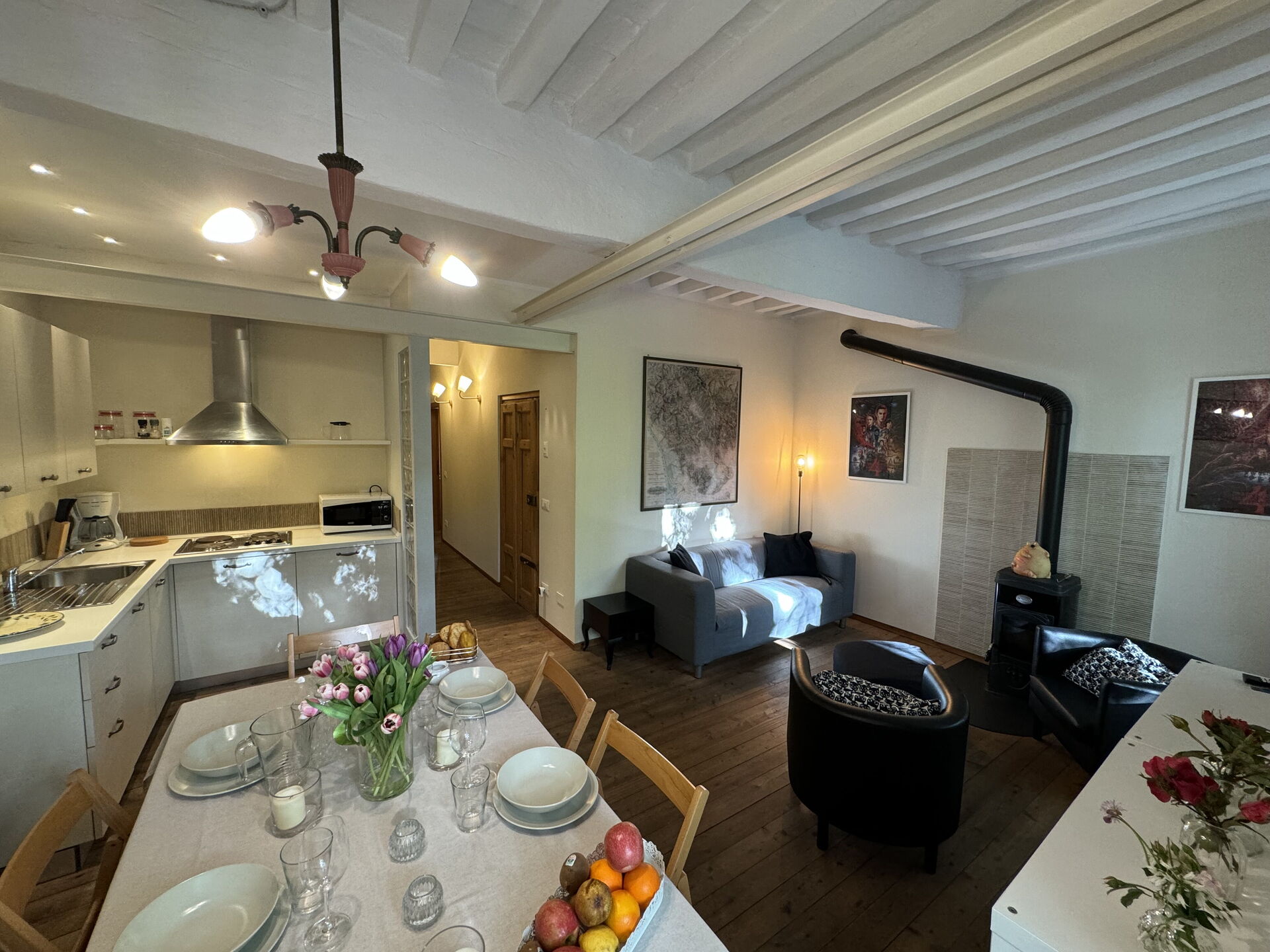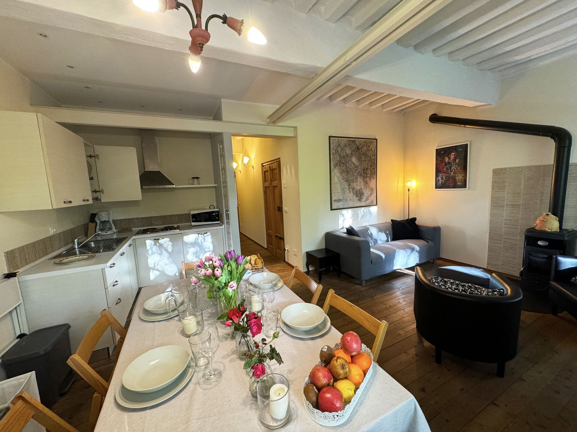 When you arrive you’ll find a nice clean well-maintained property with views of the city ideal for a relaxing vacation in Tuscany. A real benefit of renting a home, instead of multiple hotel rooms, is the ability to relax after a busy day of sightseeing with family and friends. Enjoy a meal together along with some local wine to finish the day. There is a kitchen including coffee machine, stove and refrigerator, as well as, plenty of tableware and cutlery for up to four people.