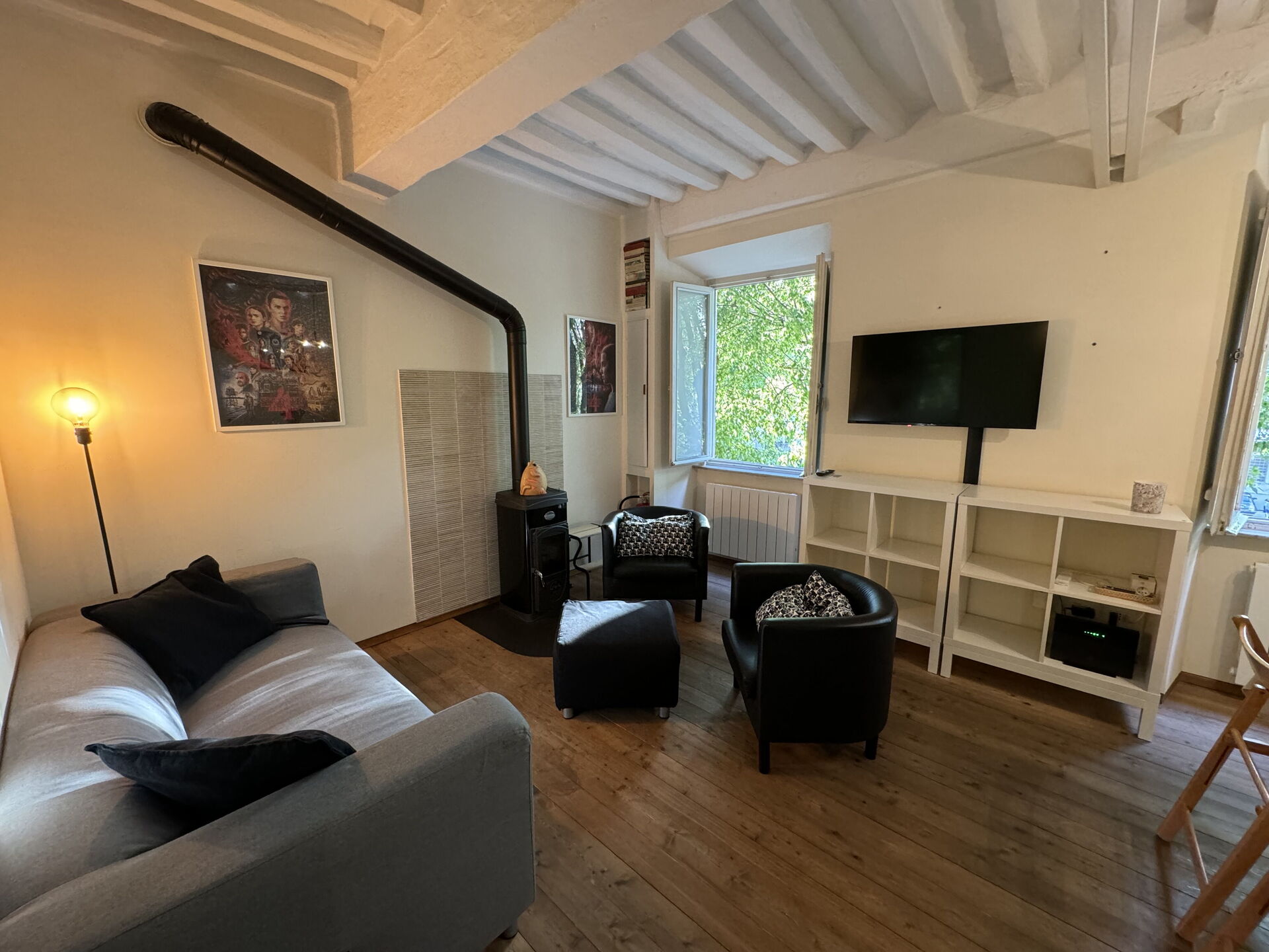 Kitchen + living room: dishwasher, fridge, freezer, microwave, stove top, wood burning stove, oven, sofa (people: 2), two armchairs, television.