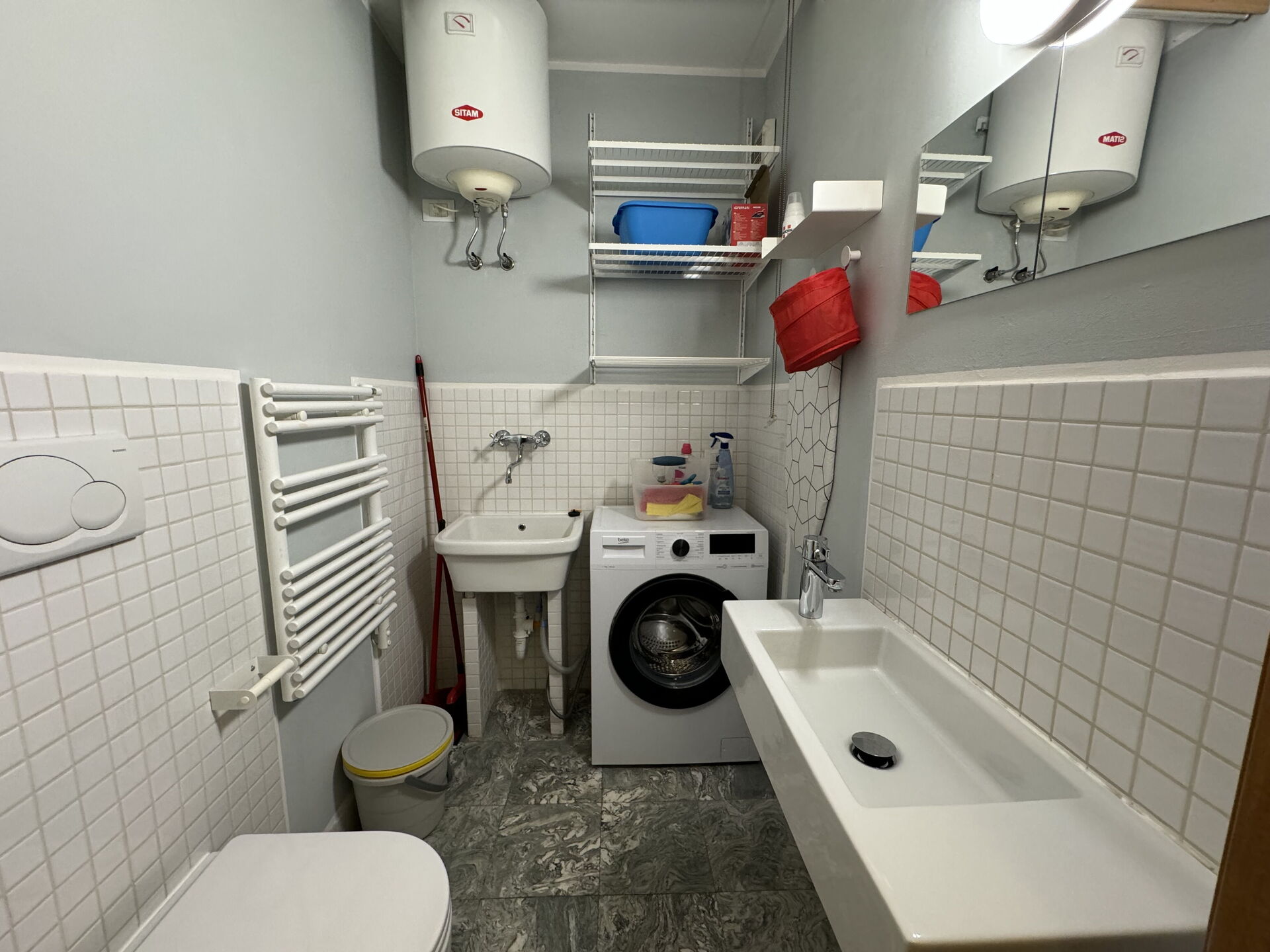Bathroom 1: basin, toilet, washing machine.