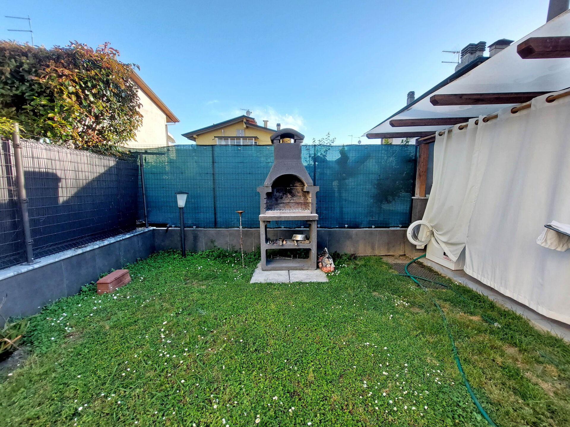 Large glass door leading to the terrace with outdoor furniture, dining table and an induction plate for outdoor cooking.