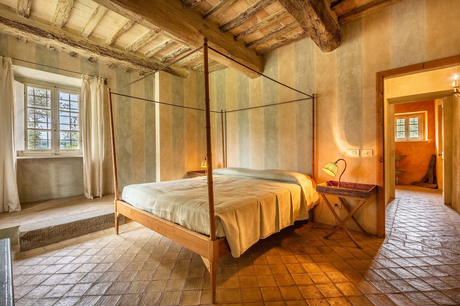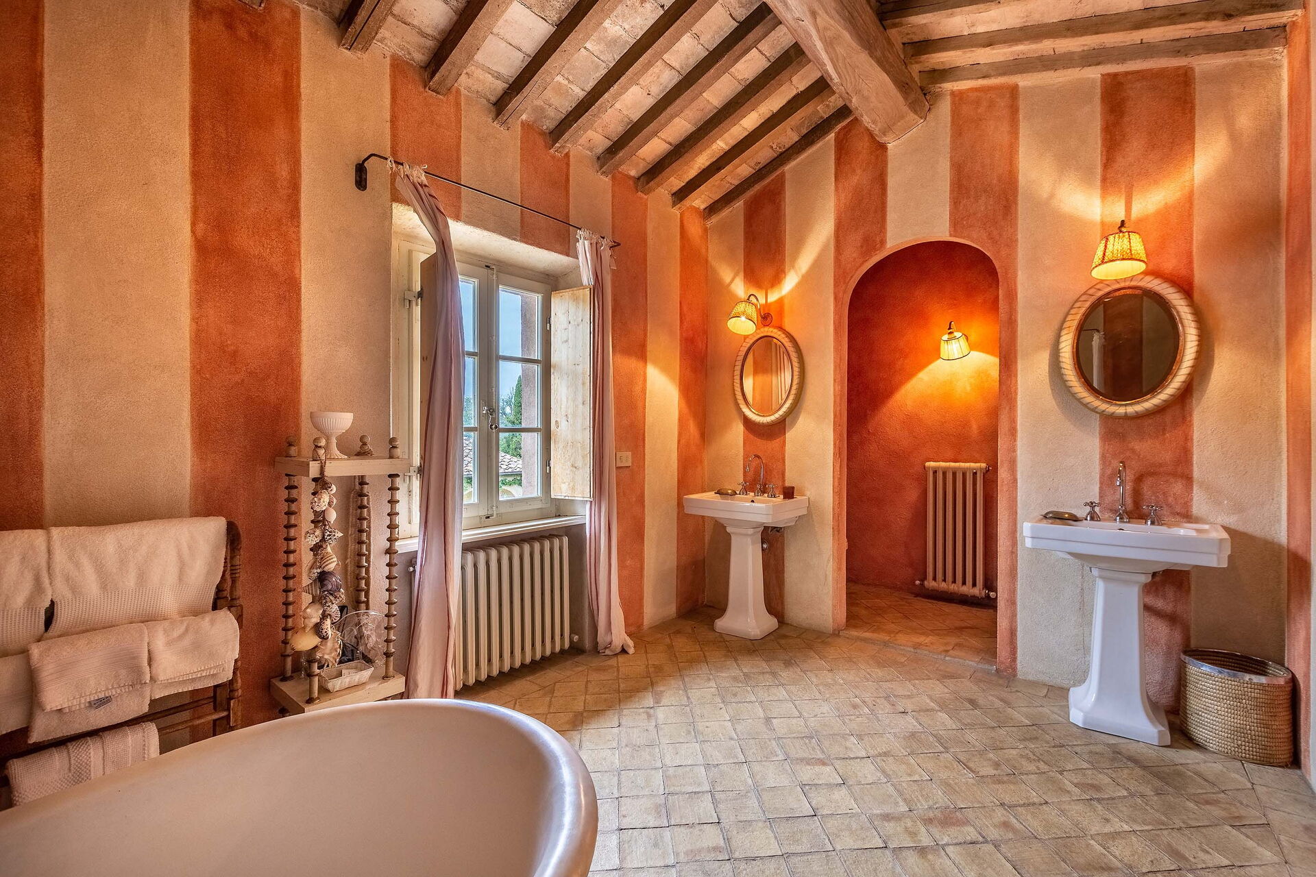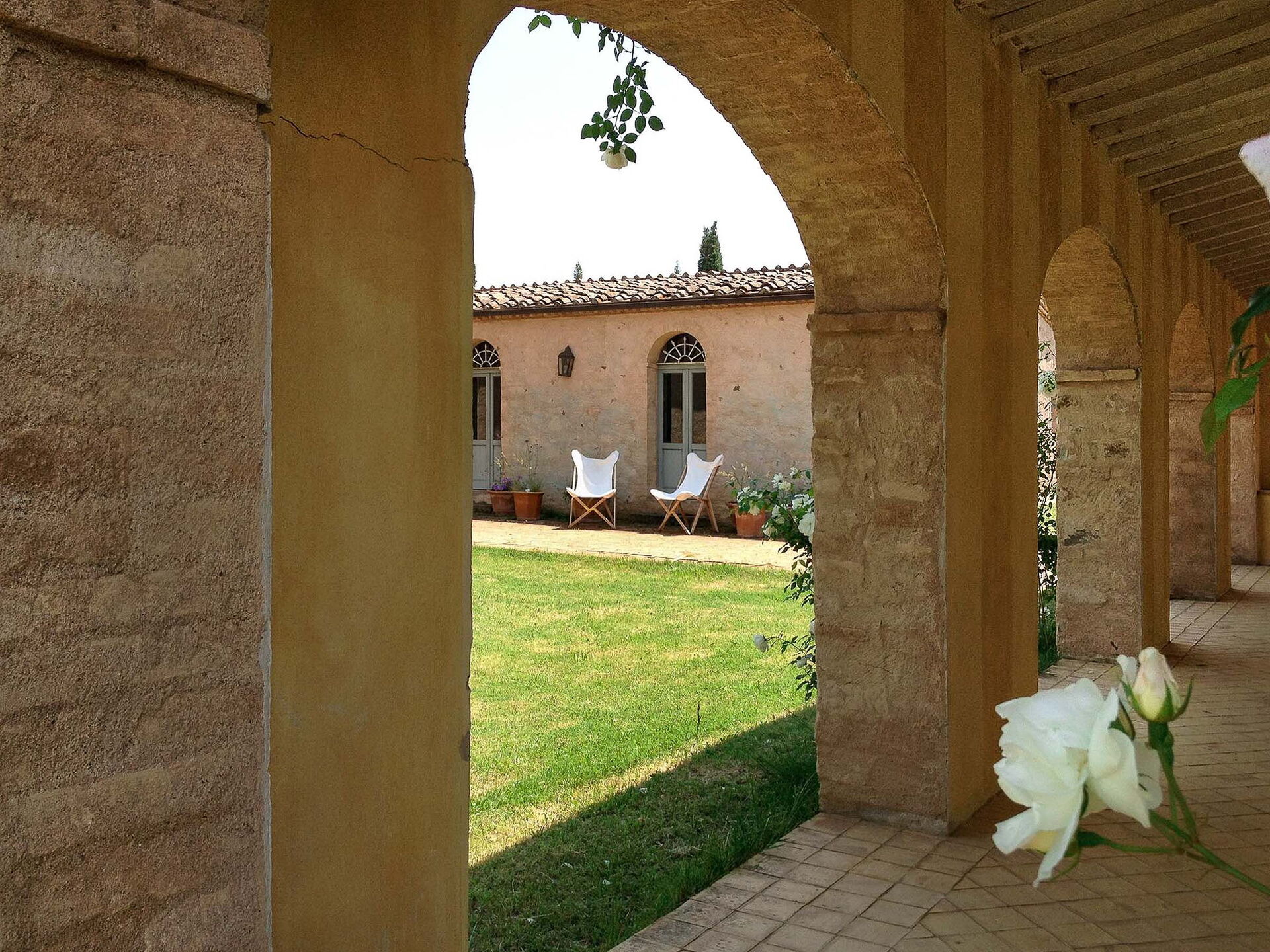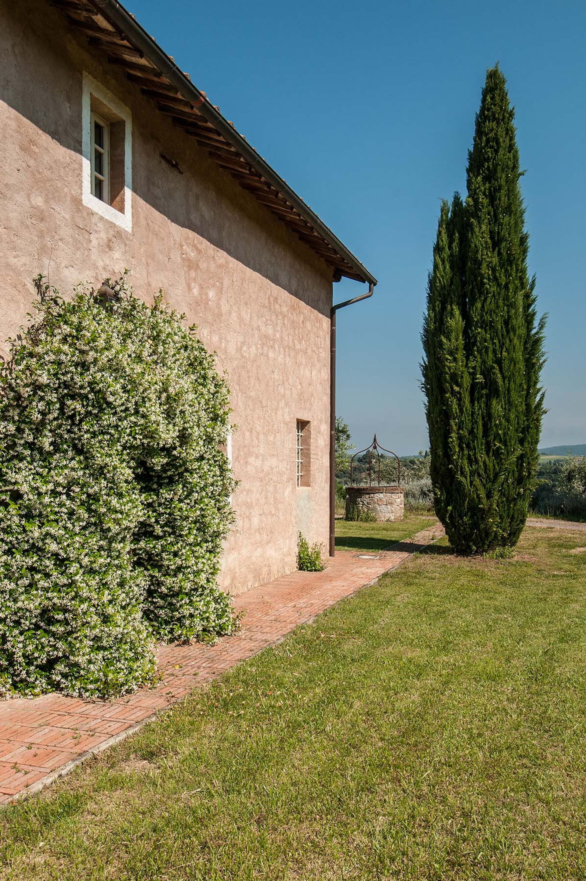 The views from the house are outstanding taking in the Val d’Orcia and Crete Senesi, considered by many as the most beautiful areas of Tuscany. The owner a renowned Italian Architect and Interior Designer restored the villa in total respect to the Tuscan tradition and furnished it with an impressive combination of furniture personally designed and some antiques ones. The property comprises the main Tuscan stone-built farmhouse and a bedroom with en-suite bathroom in the guesthouse. Other bedrooms with en-suite bathroom can be rented at extra cost sleeping up to 18 people. Lavacchio has been restored and furnished to high standard all the first floor bedrooms have air-conditioning and two other portable units are available on request.
