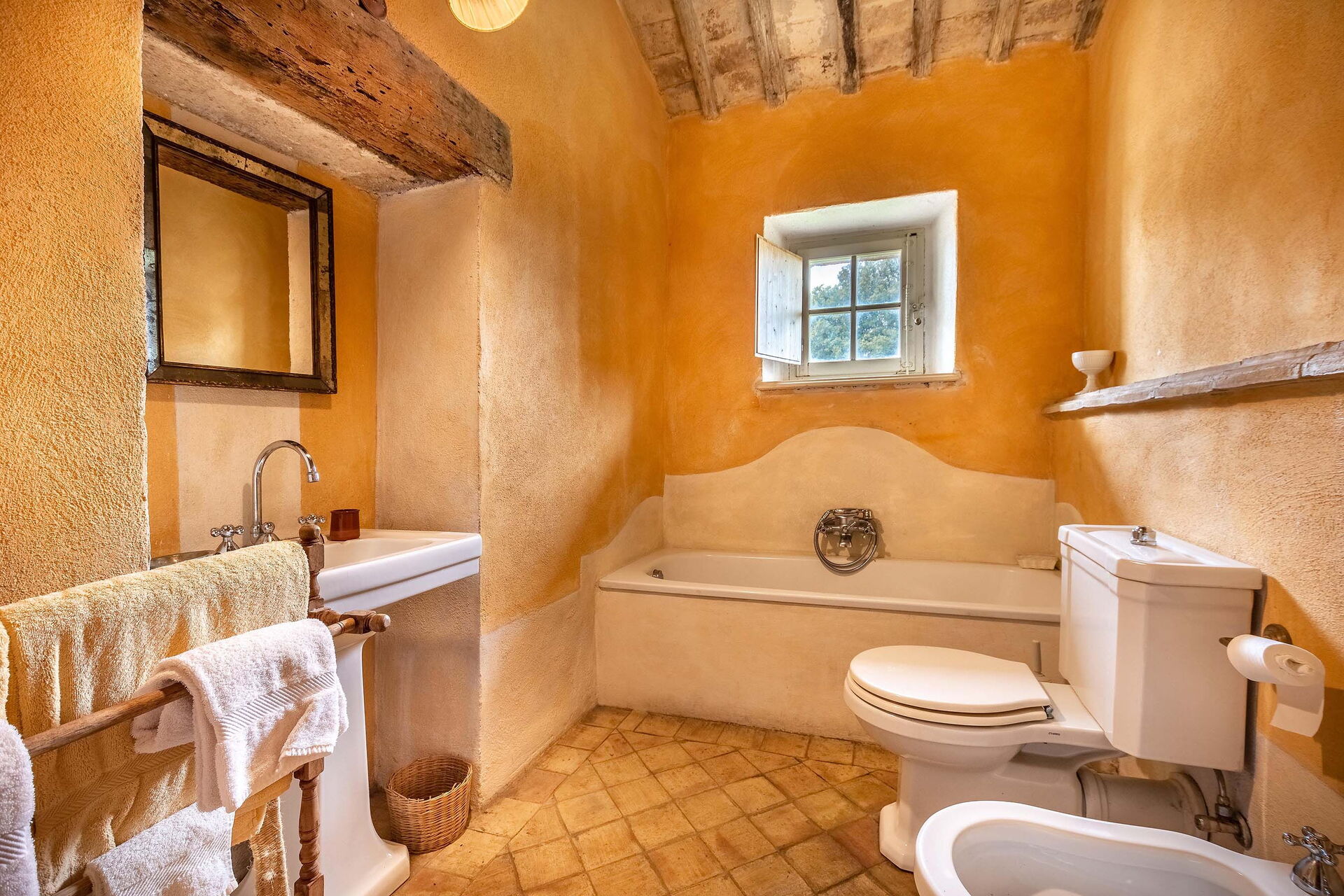 Bedroom + Ensuite Bathroom: double bed, WIFI internet, basin, toilet, bidet, bathtub, hairdryer.