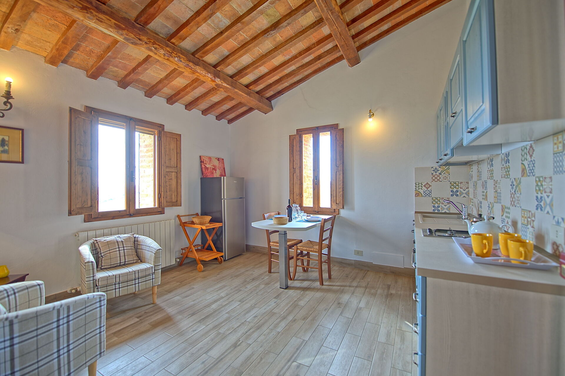 Ground floor: dining area with 2 armchairs and hideaway kitchen (2 electric burners, small dishwasher, refriegerator), double bedroom with ensuite bathroom with shower.