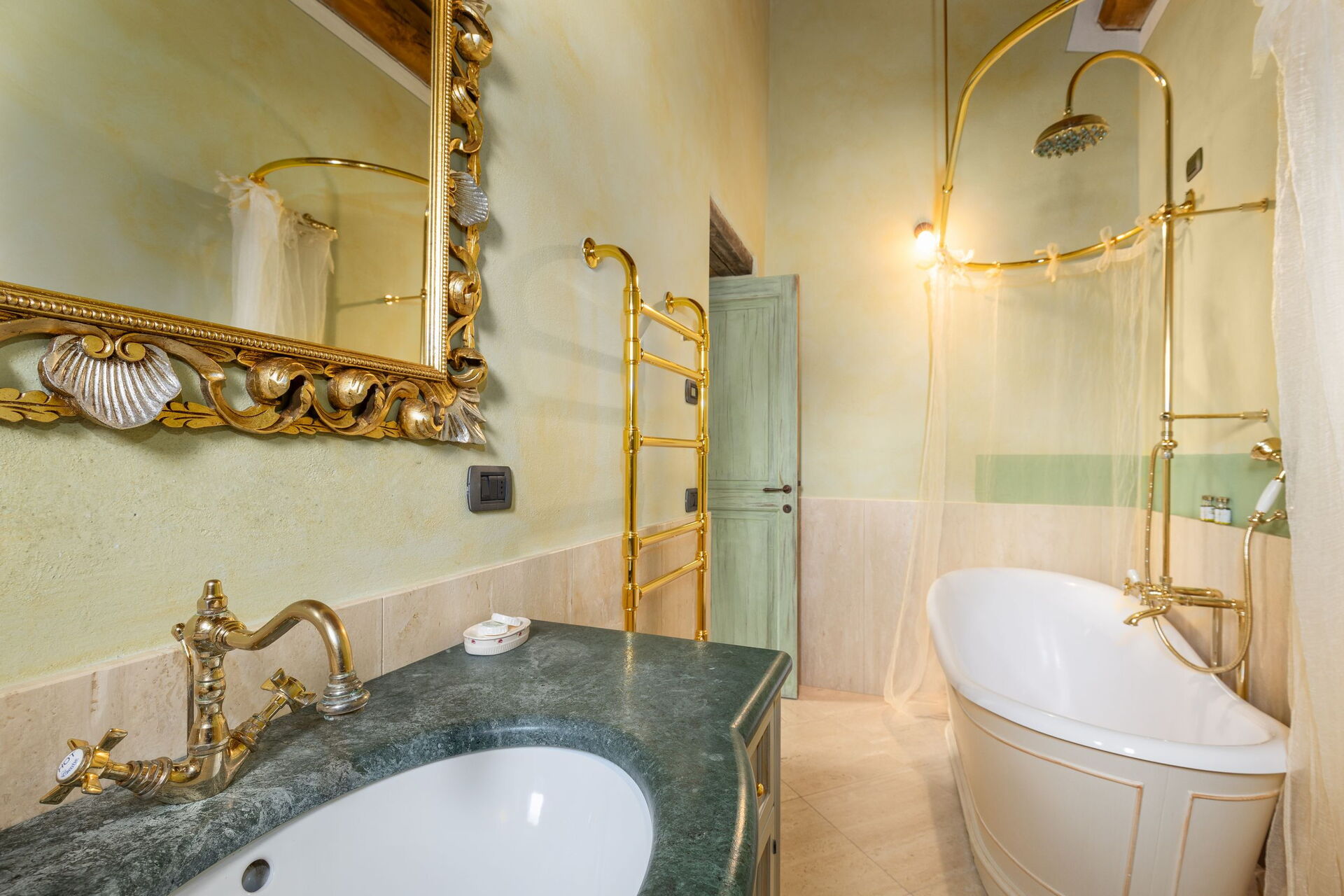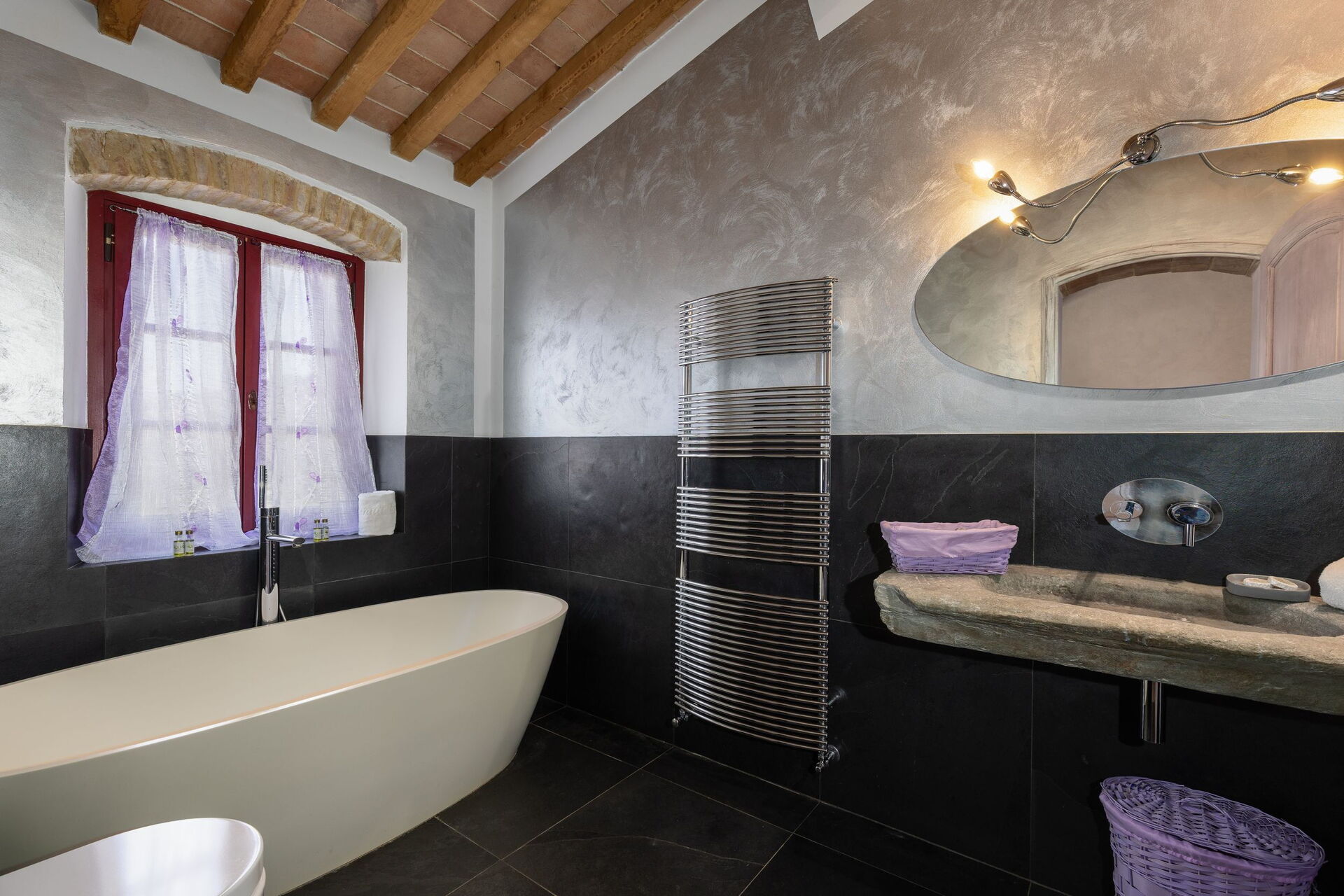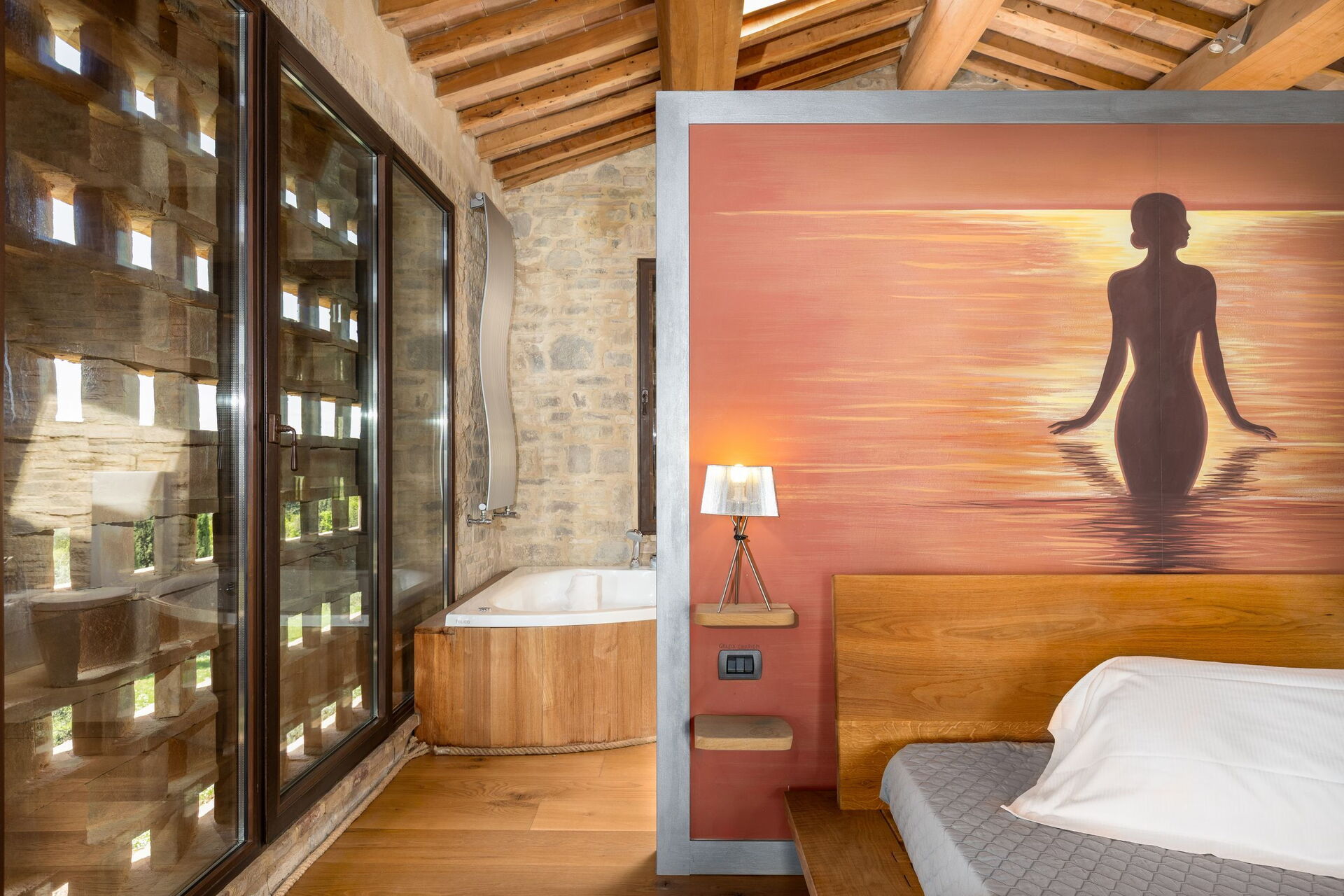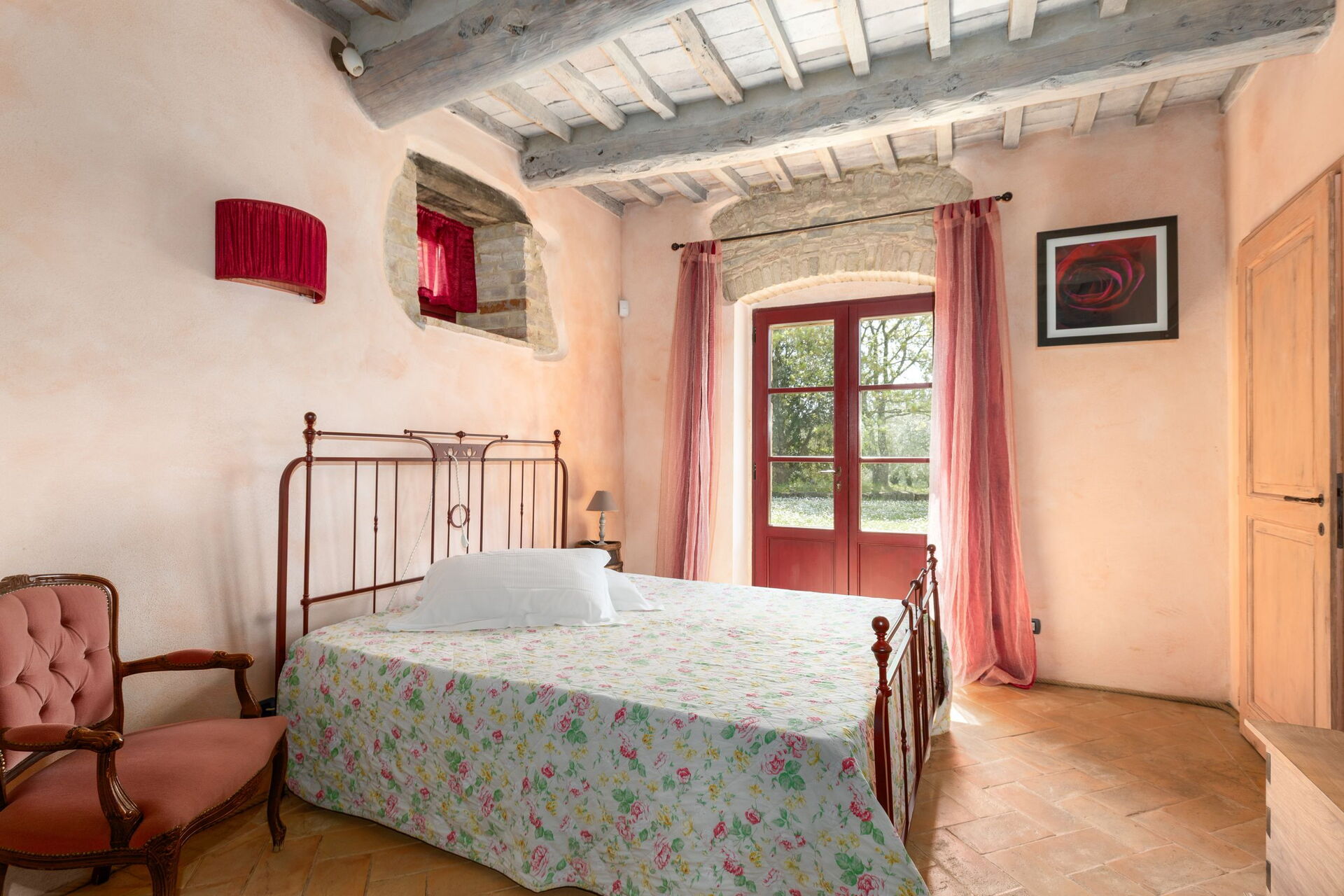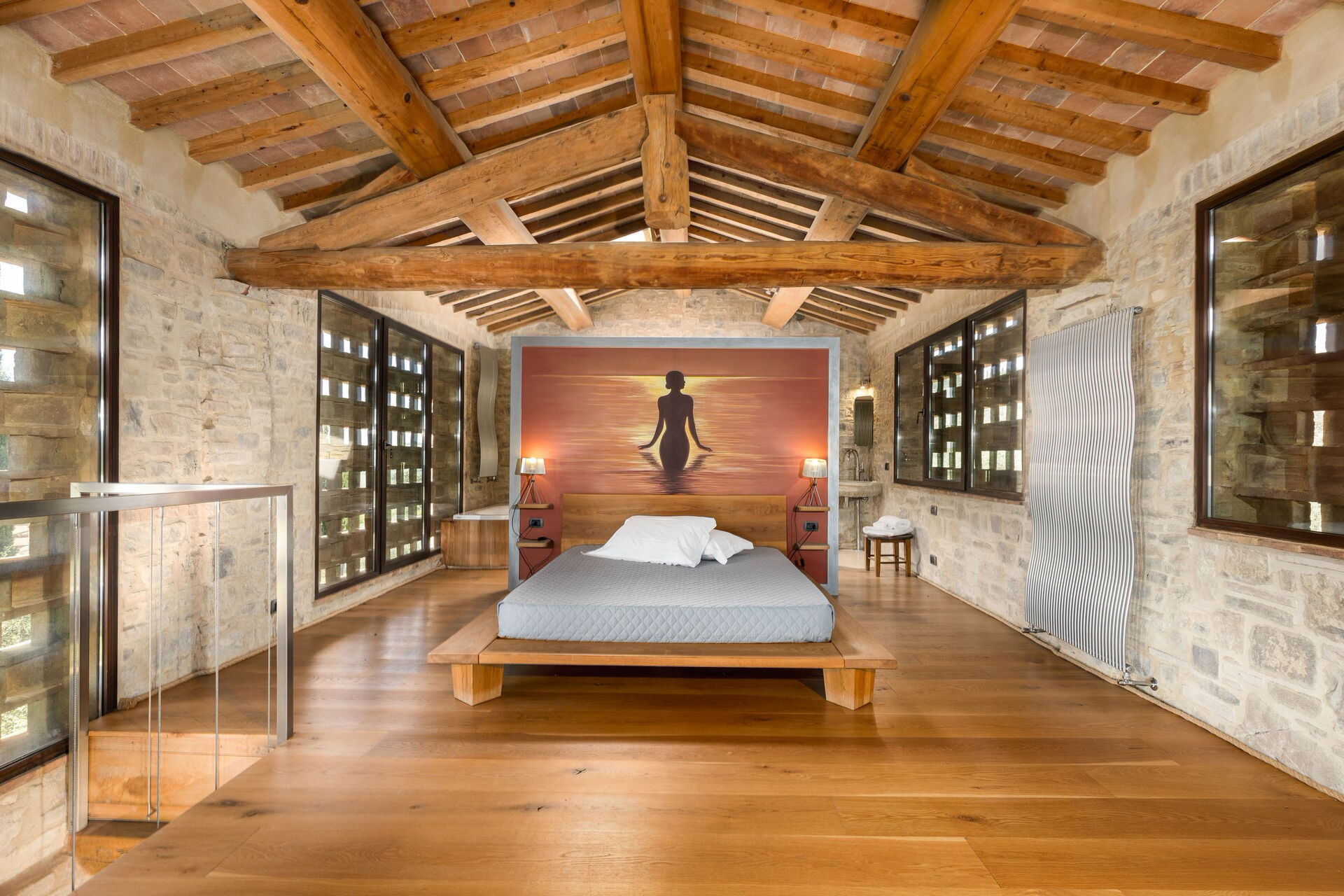 First floor: large double bedroom with ensuite bathroom with Jacuzzi bathtub (the bathroom is open on to the bedroom).
