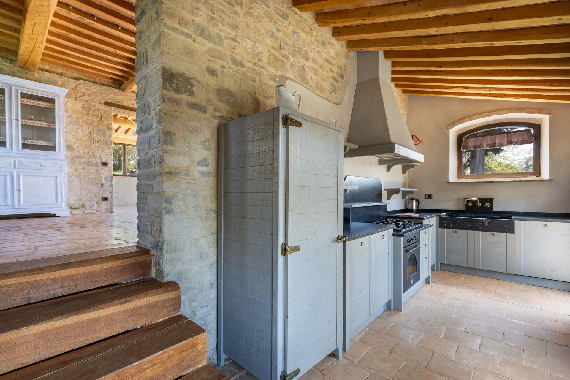 Ground floor: entrance into the living room with fireplace, kitchen (oven, freezer, refrigerator with ice maker, microwave, dishwasher, toaster, American coffee maker, espresso coffee maker), dining area, wc, double bedroom with private bathroom with shower (suitable for disabled guests).