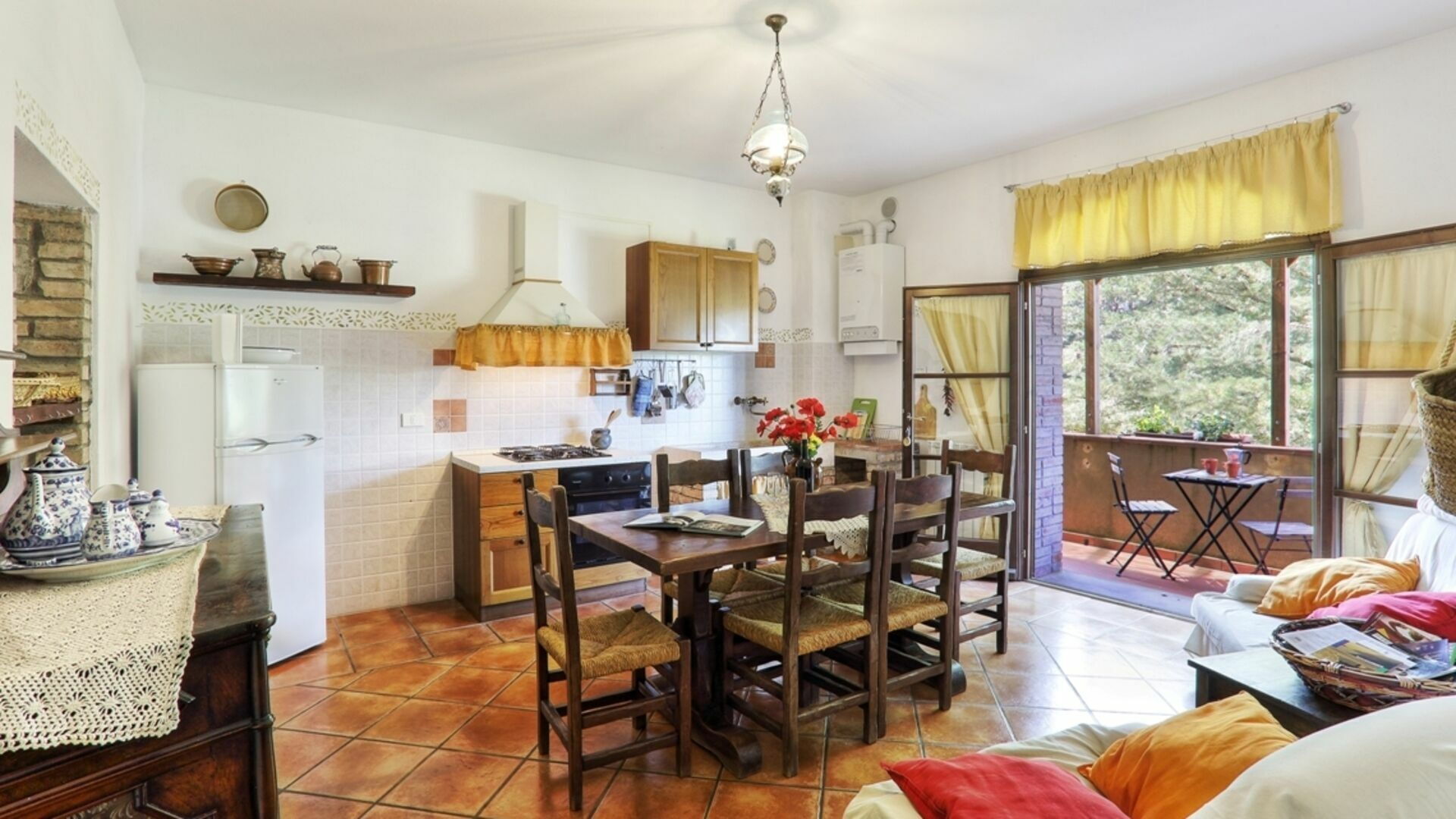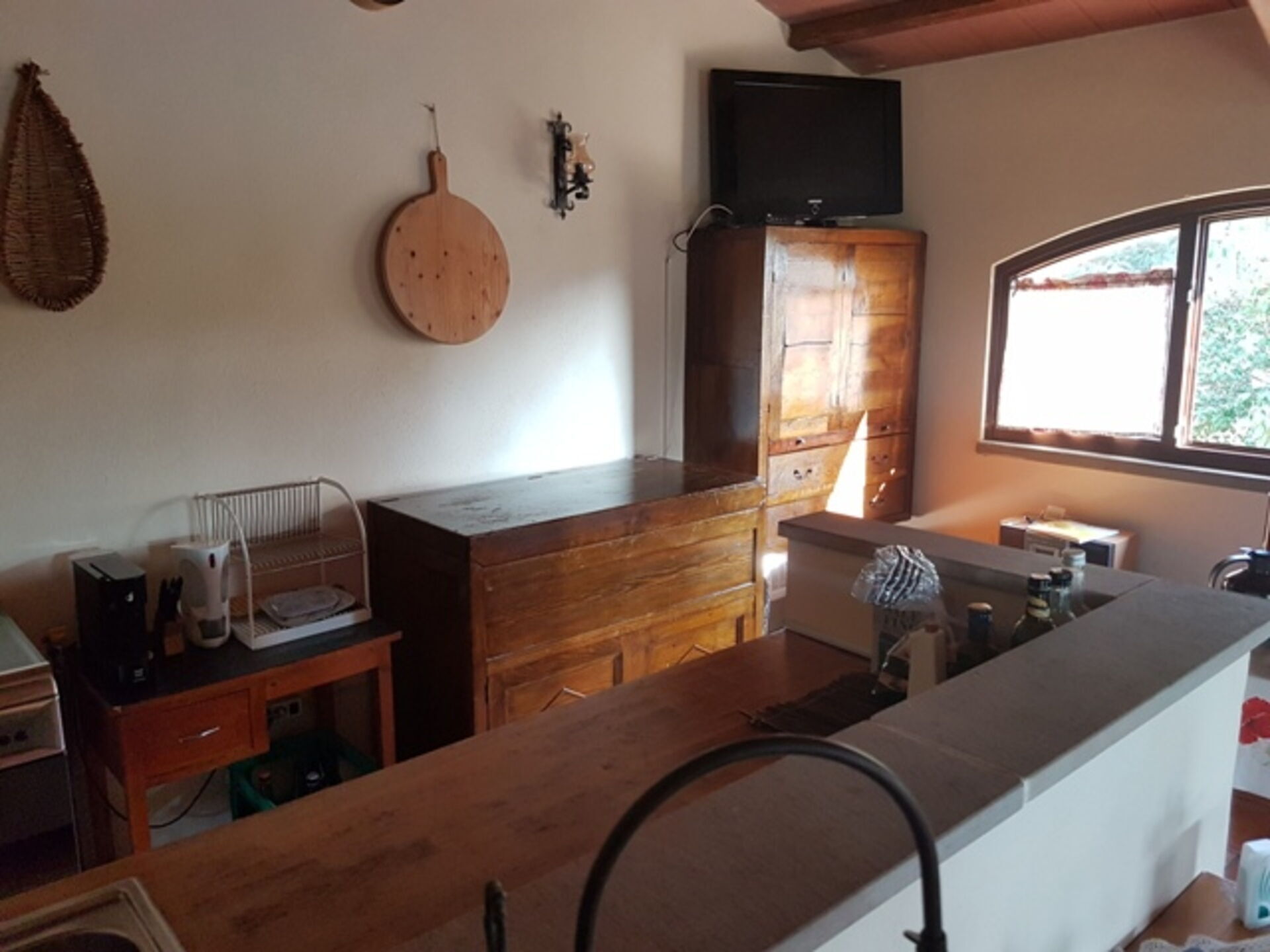 Kitchen + living room 2: well equipped kitchen, dining table, fridge, stove top, oven, sofa, satellite tv.
