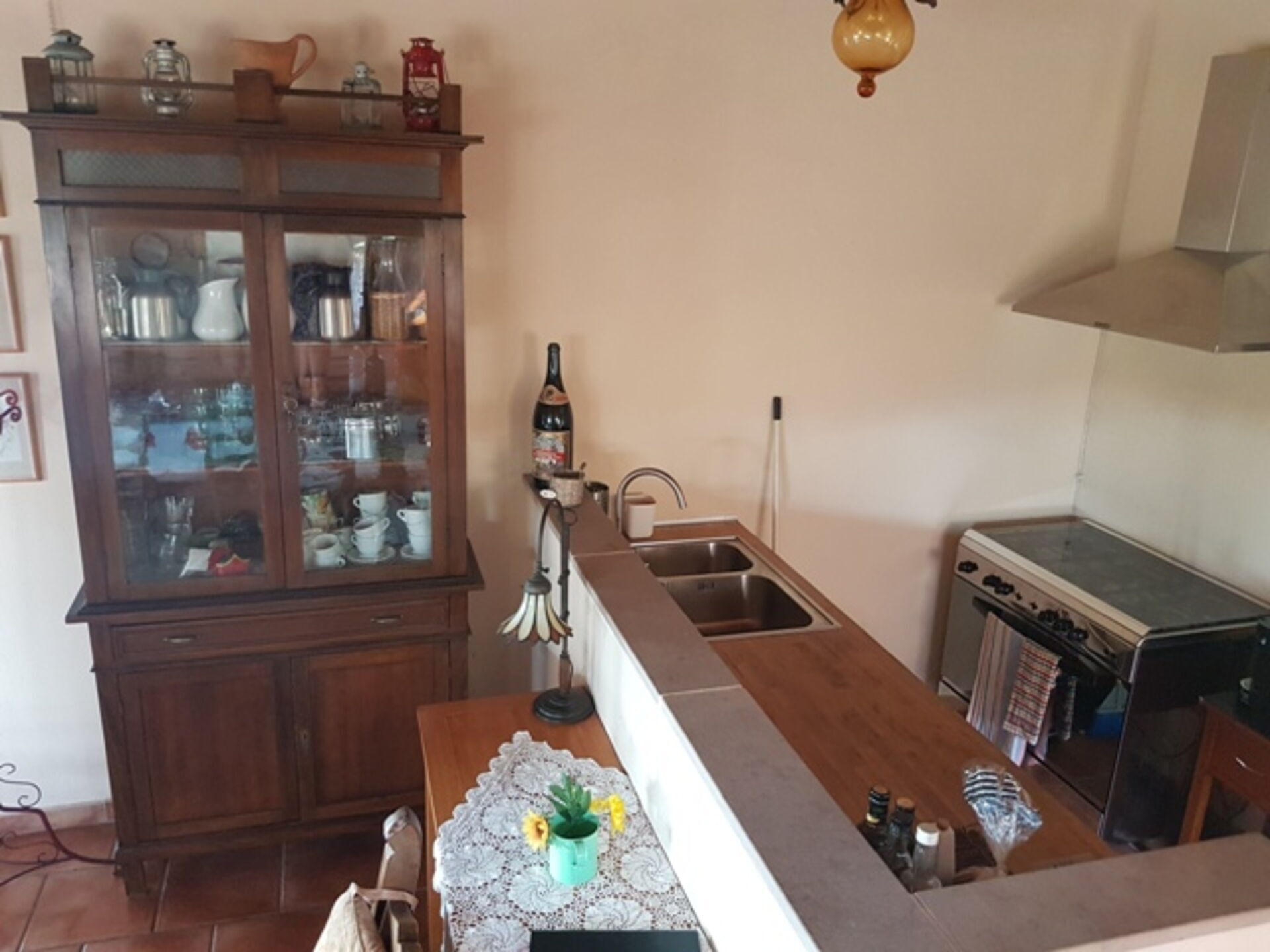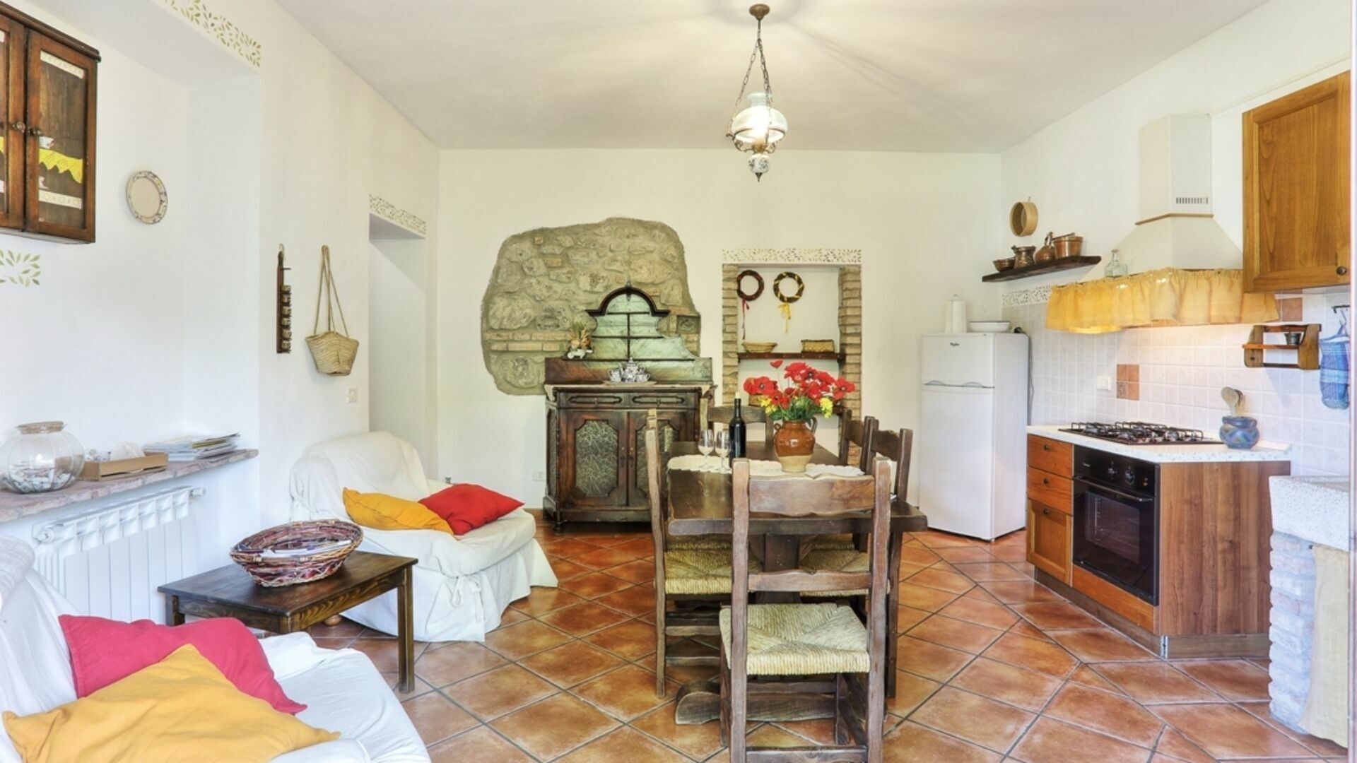Kitchen + living room 1: well equipped kitchen, dining table, fridge, stove top, oven, sofa, satellite tv.