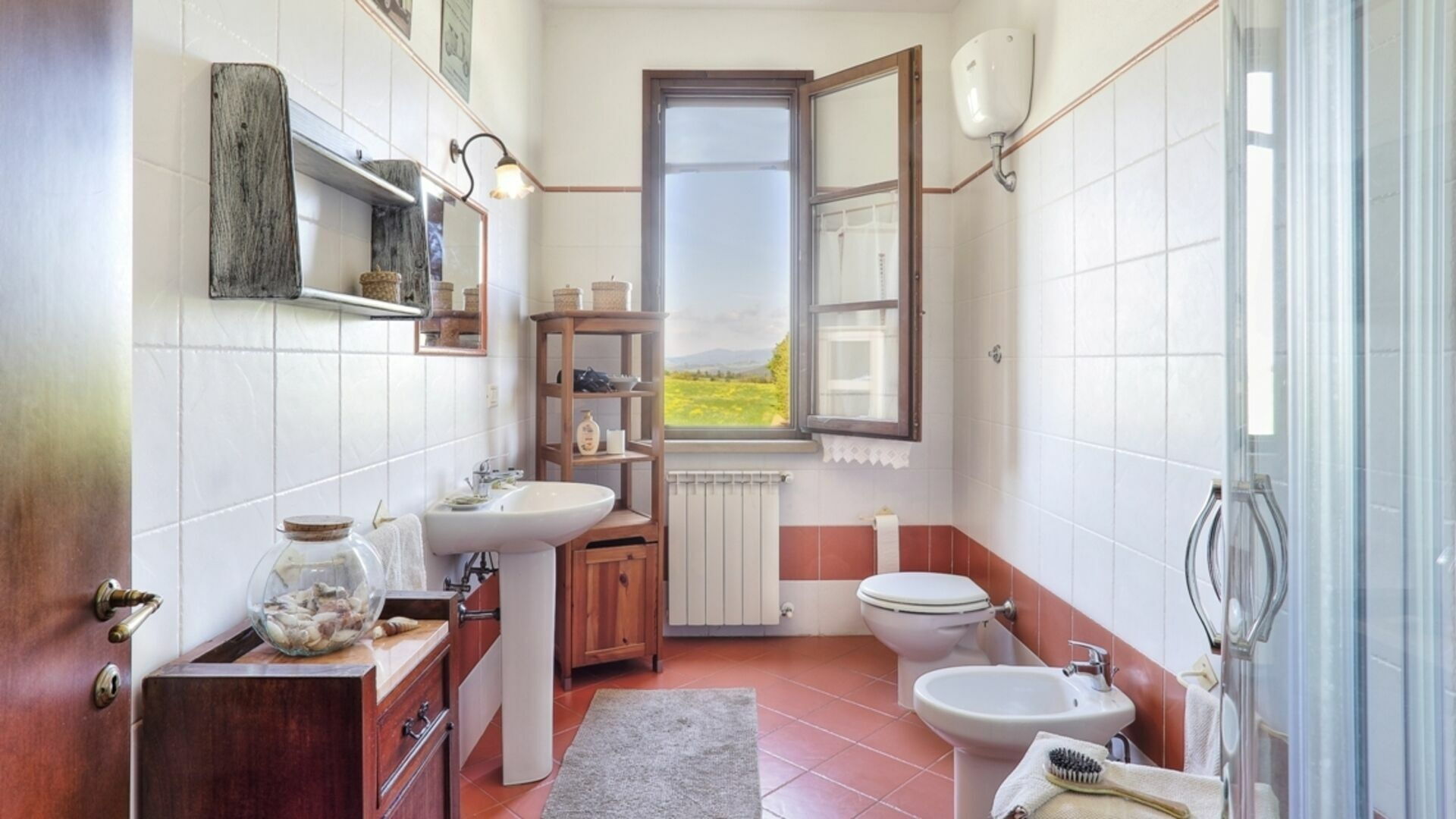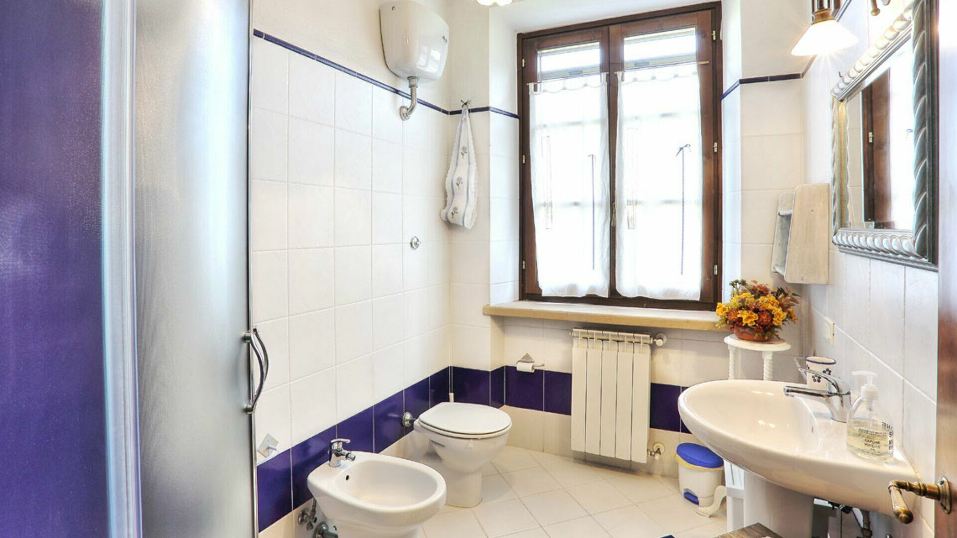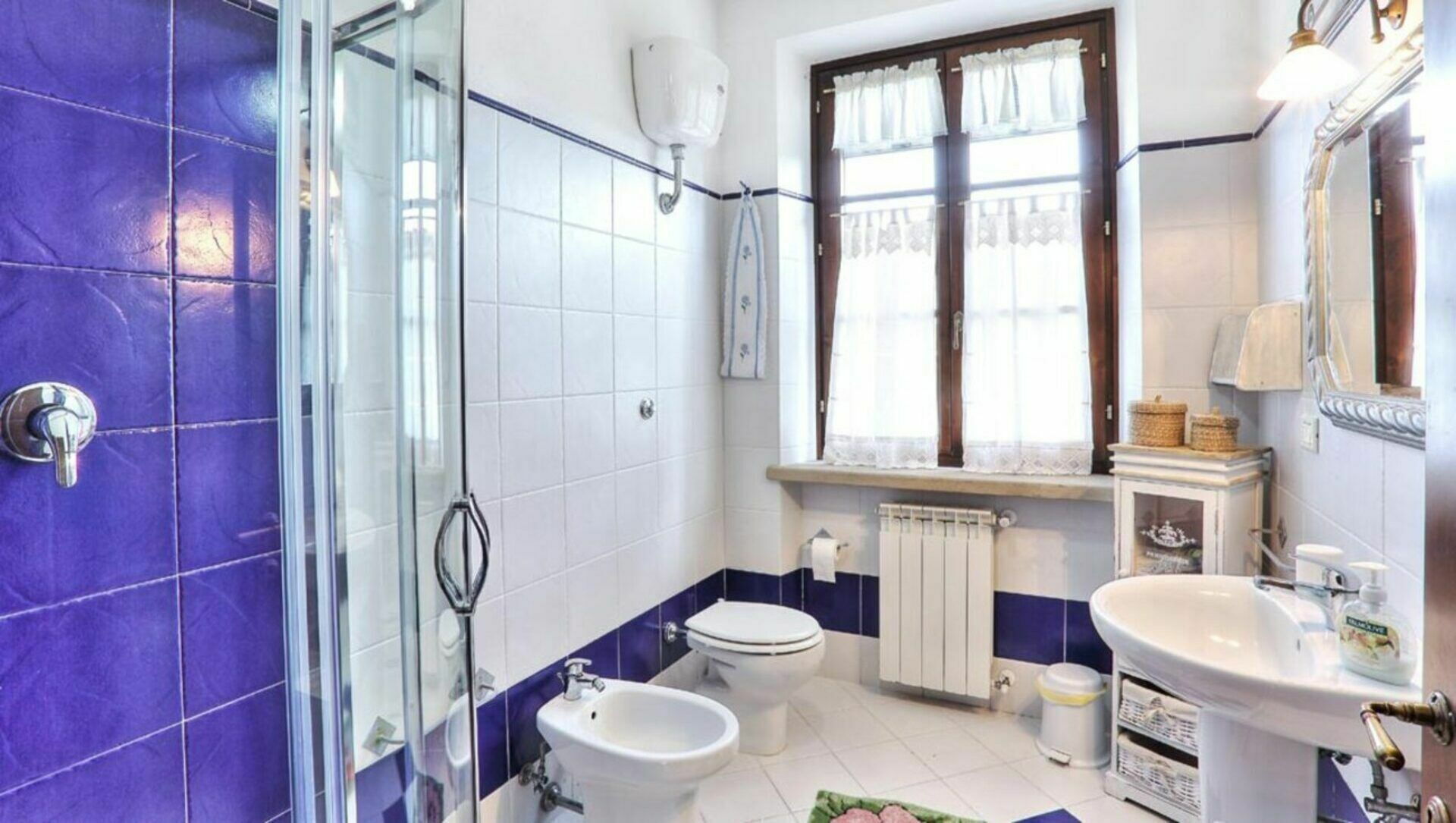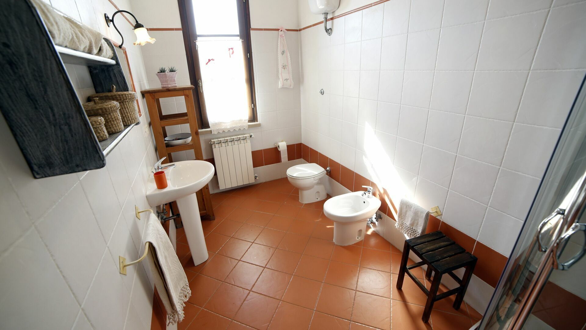 Bathroom 1: basin, toilet, bidet, shower.