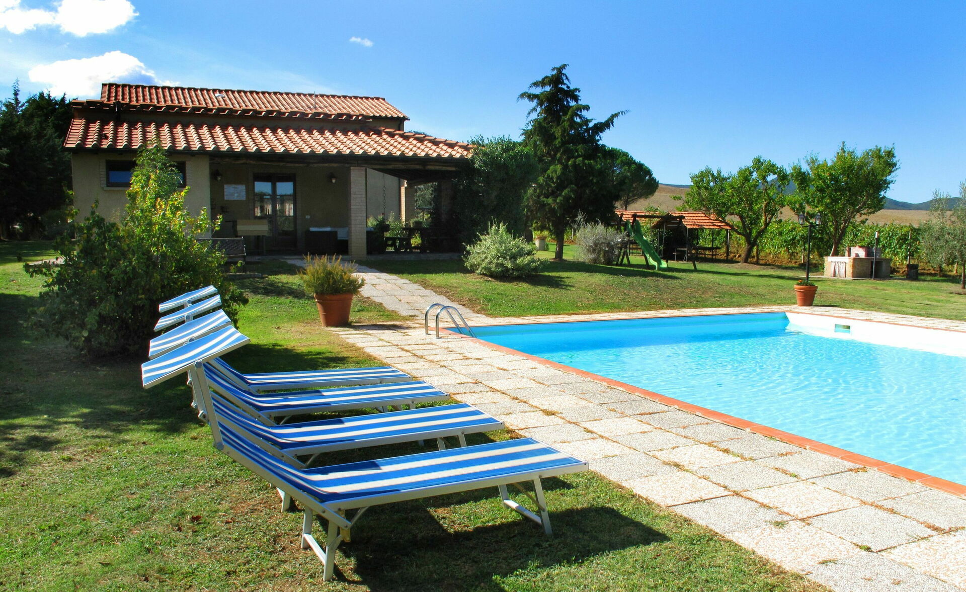Garden: swimming pool (private, length: 12m, width: 7m, outdoor), barbecue, garden furniture, ten sunbeds, children's playground.
