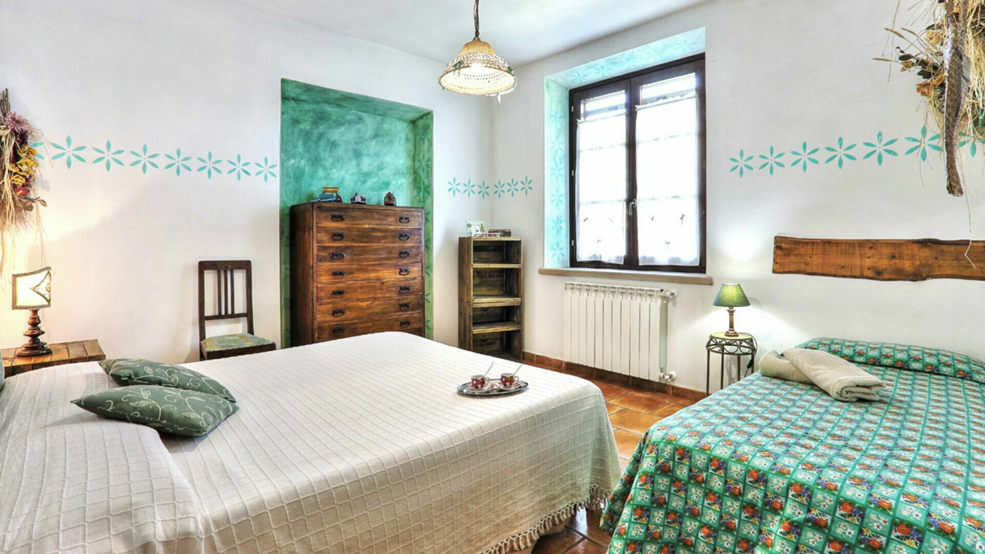 Bedroom 1: two single beds, french bed.