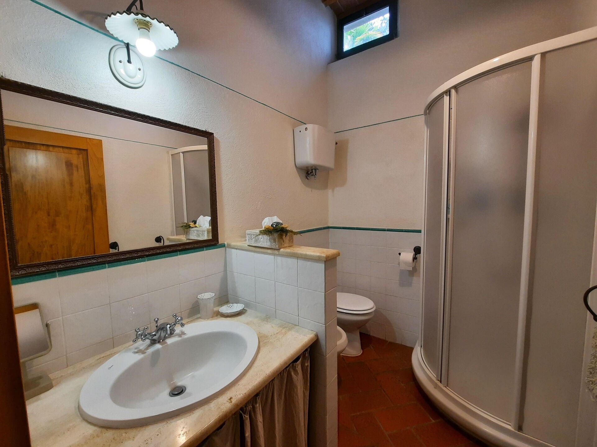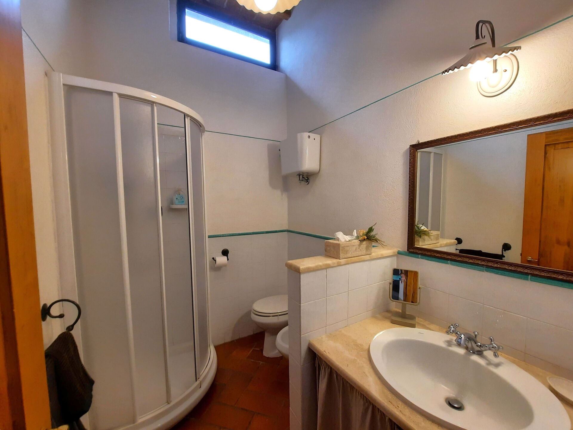 Bathroom: basin, toilet, shower.