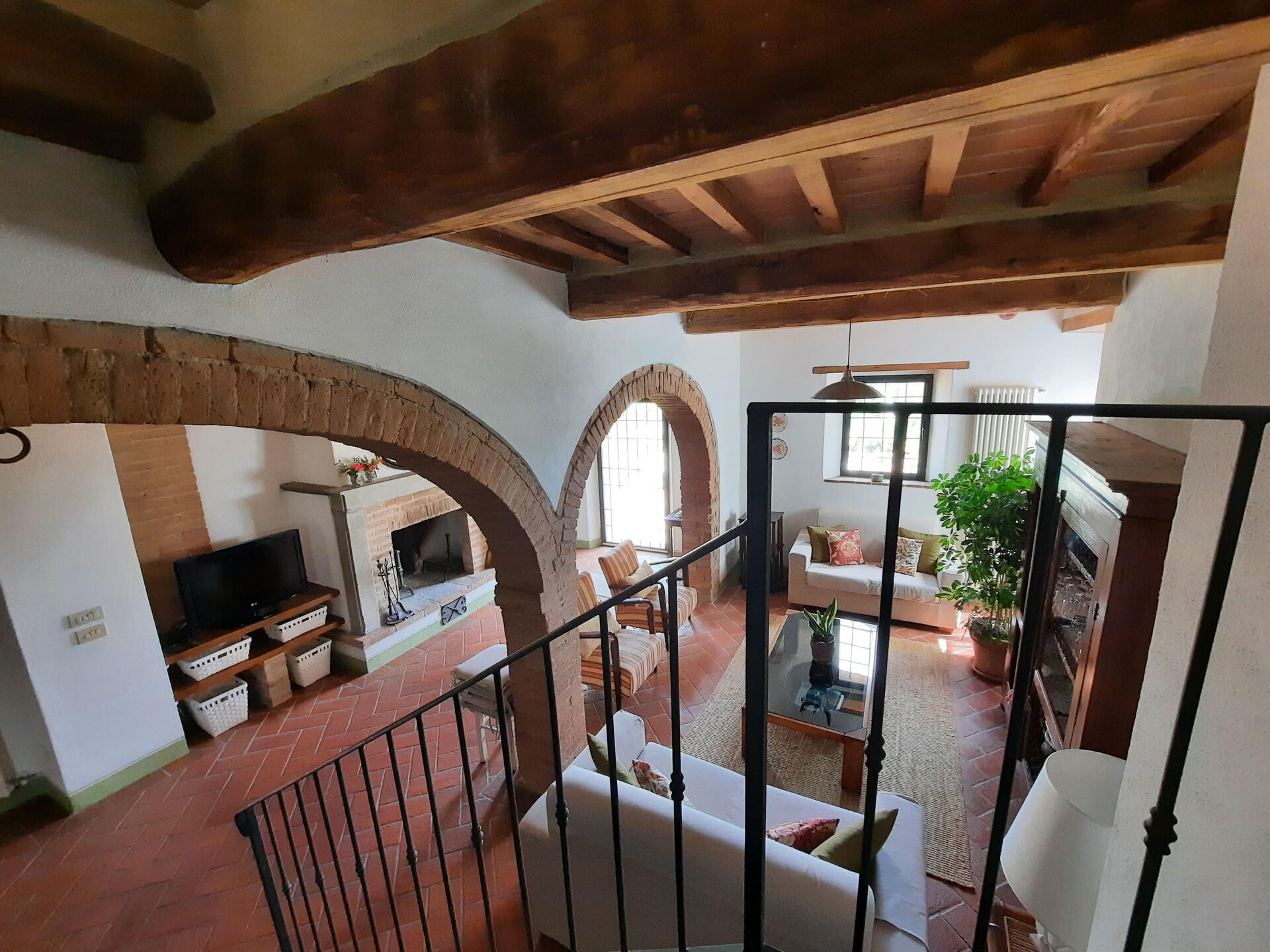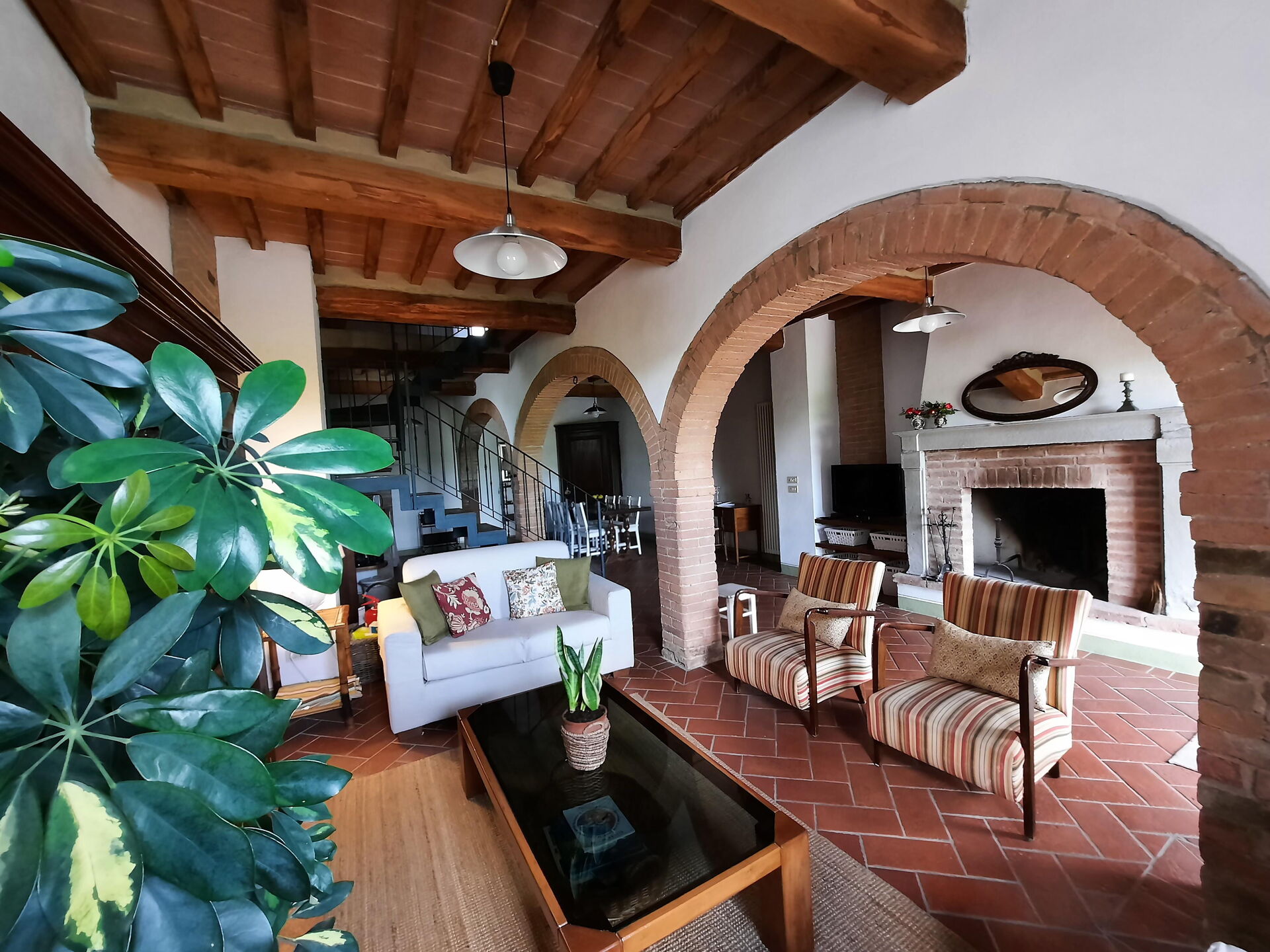 Kitchen + living room: well equipped kitchen, dining table (people: 6), dishwasher, fridge, freezer, stove top, oven, toaster, italian coffee machine, american coffee machine, washing machine, two sofas (people: 6), two armchairs, working desk, fireplace, WIFI internet, internet, satellite tv, television, portable fan, exit to the garden.