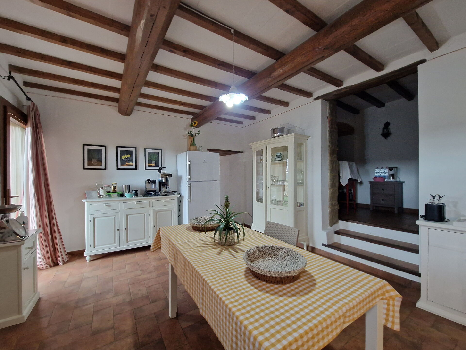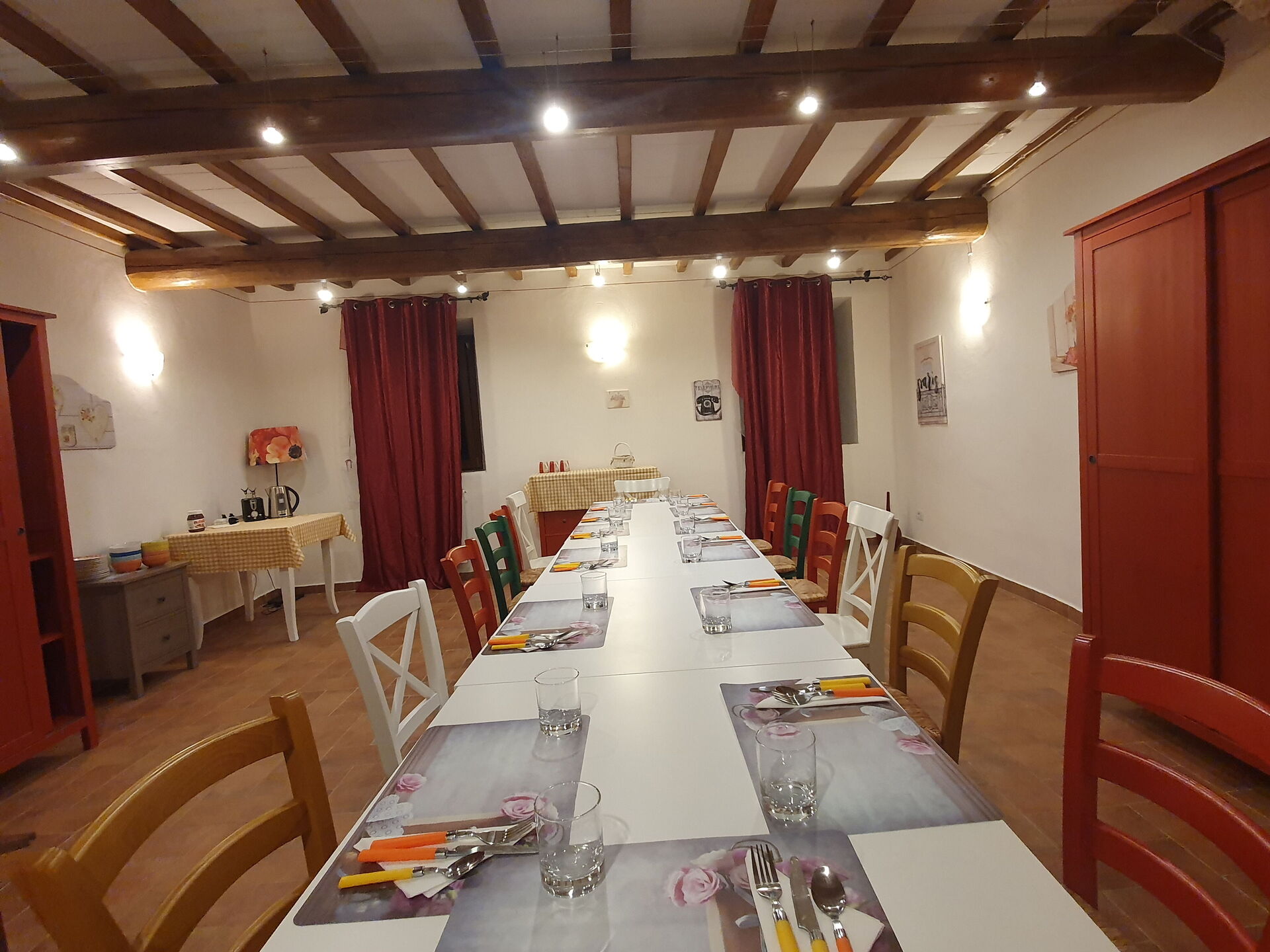 There is a common area where guests can cook and have meals all together. It is composed by: 1 large kitchen fully equipped, 2 bathrooms, 1 dining room that seats up to 22 people, a food warehouse, plus an outdoor sofa and a long table to eat al fresco.