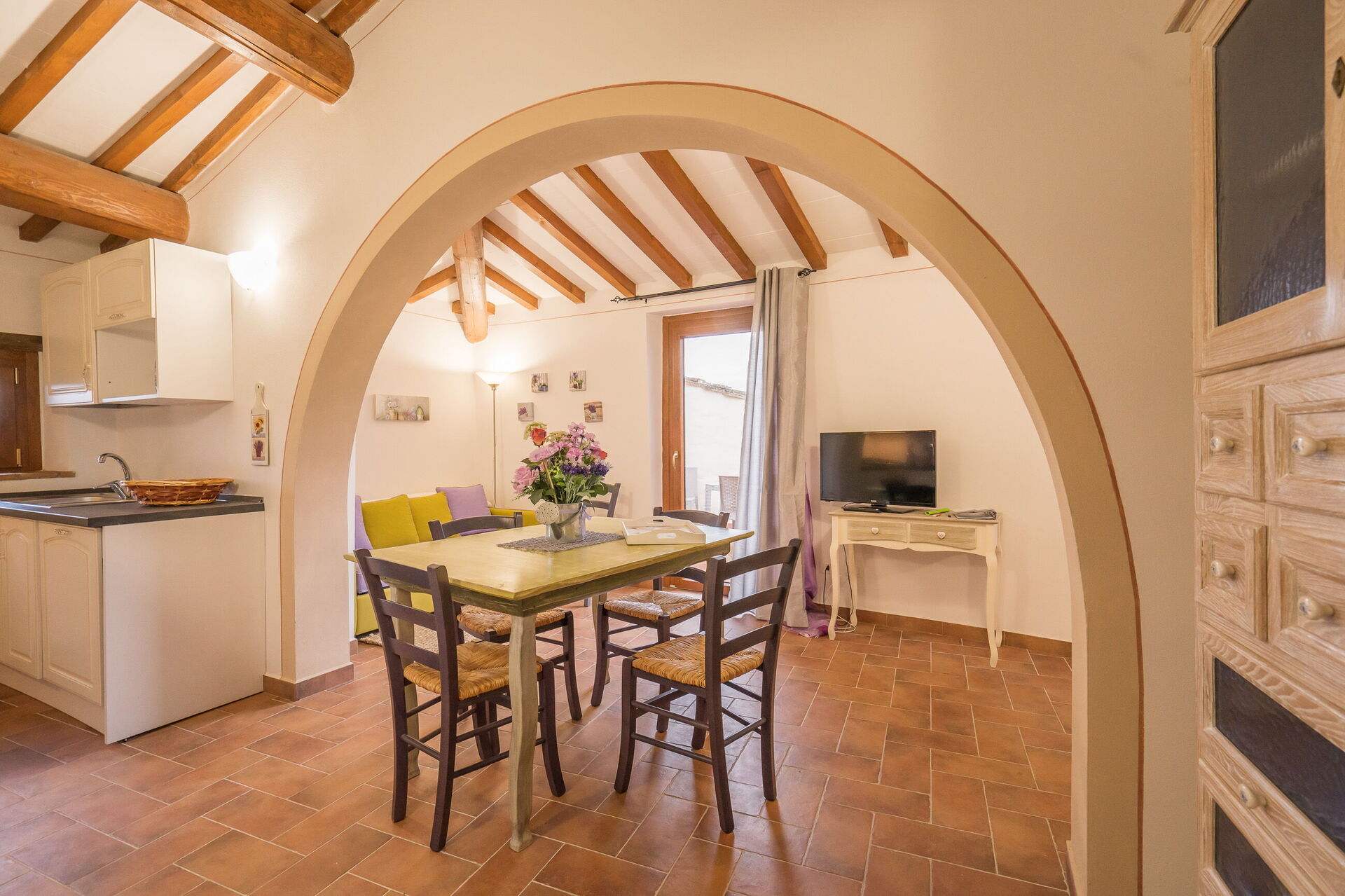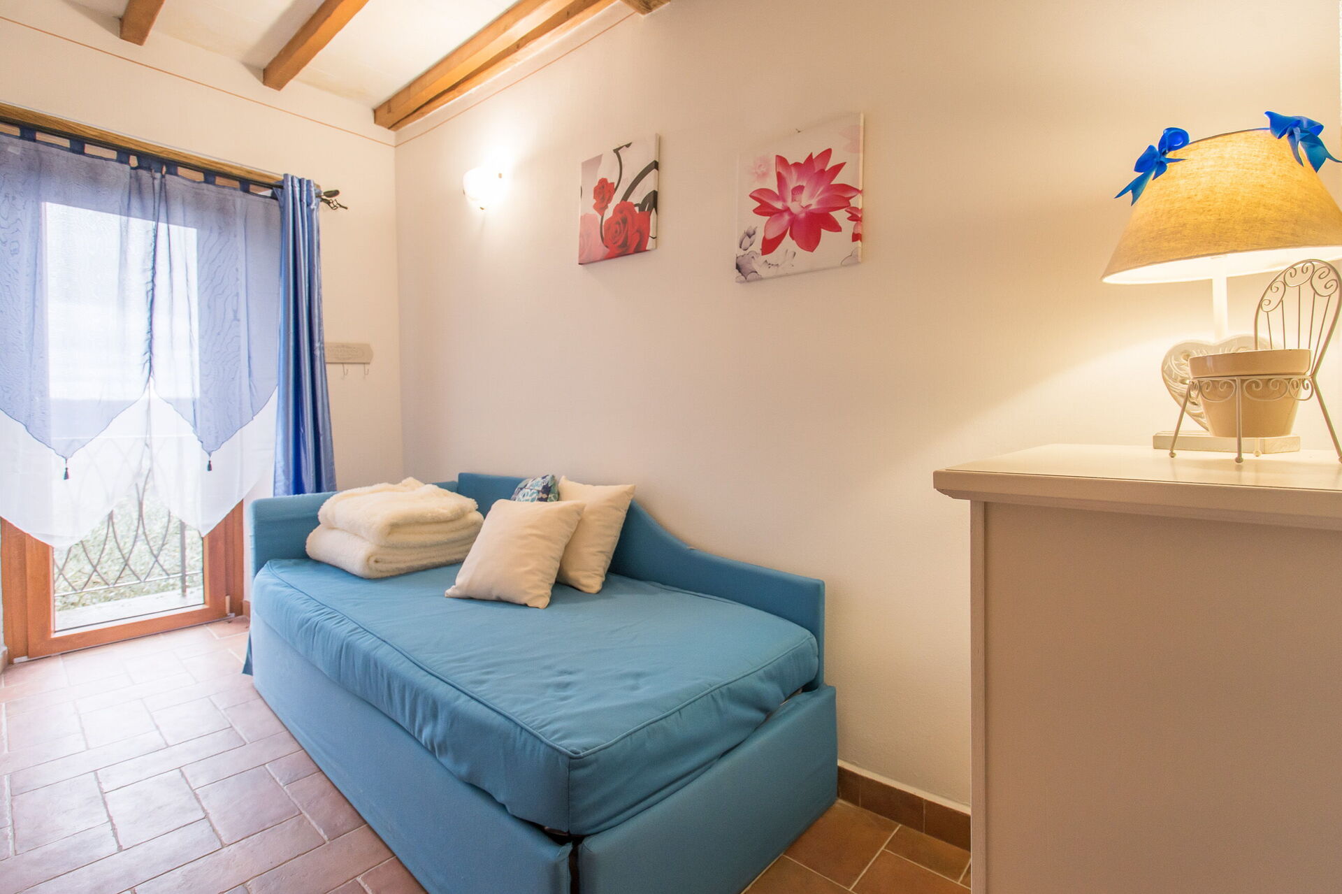 Kitchen + living room: well equipped kitchen, dining table (people: 4), fridge, microwave, stove top, american coffee machine, sofa (people: 3), WIFI internet, satellite tv, exit to the terrace.