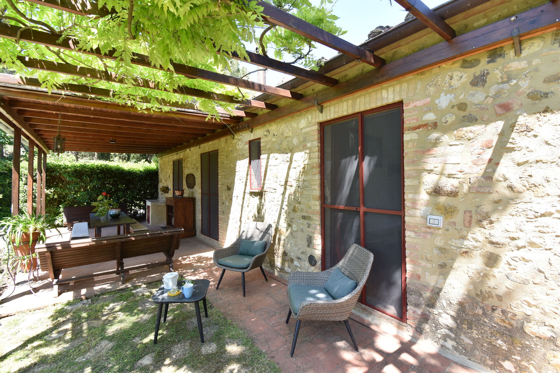 Patio: al fresco dining, three dining tables (people: 12), WIFI internet, garden furniture.